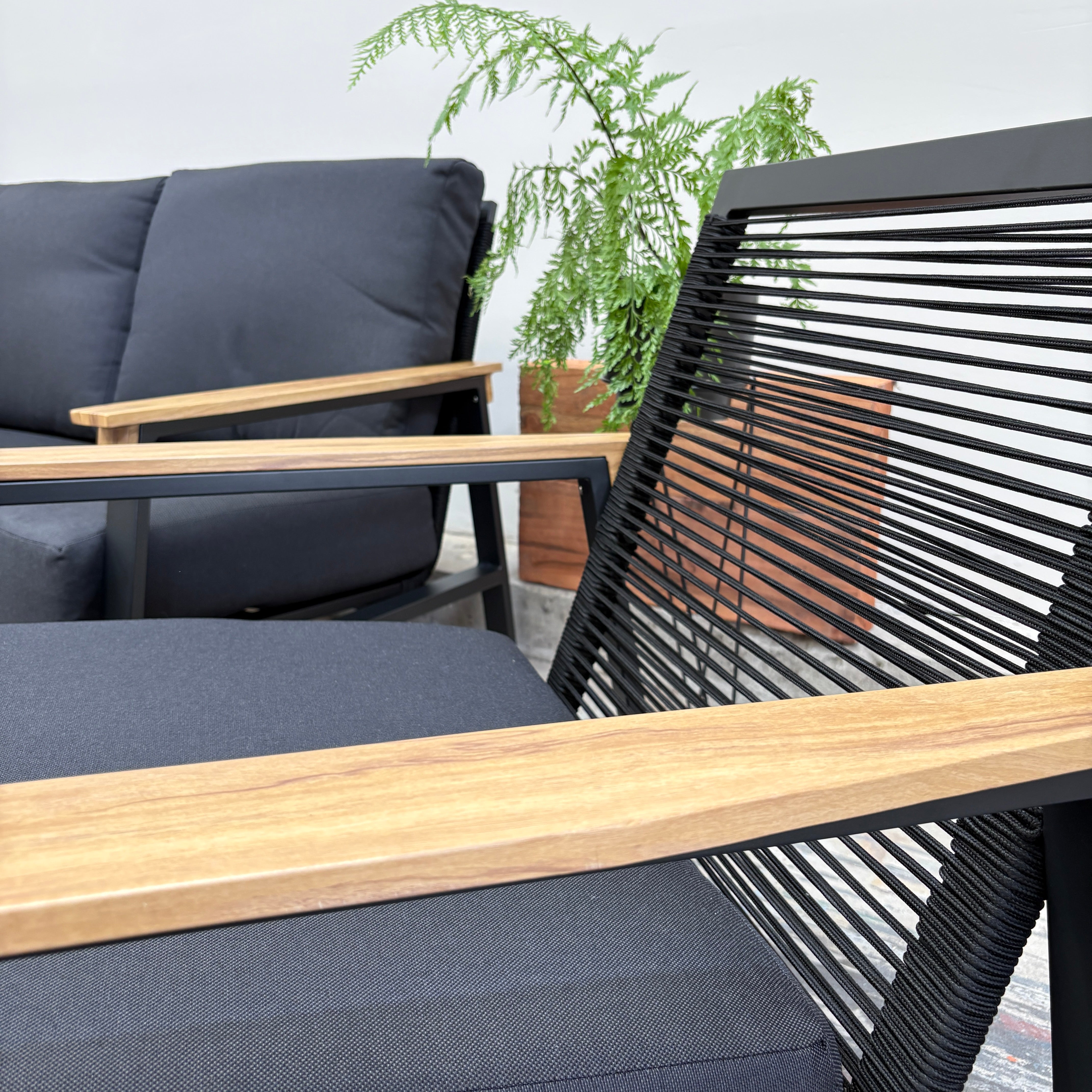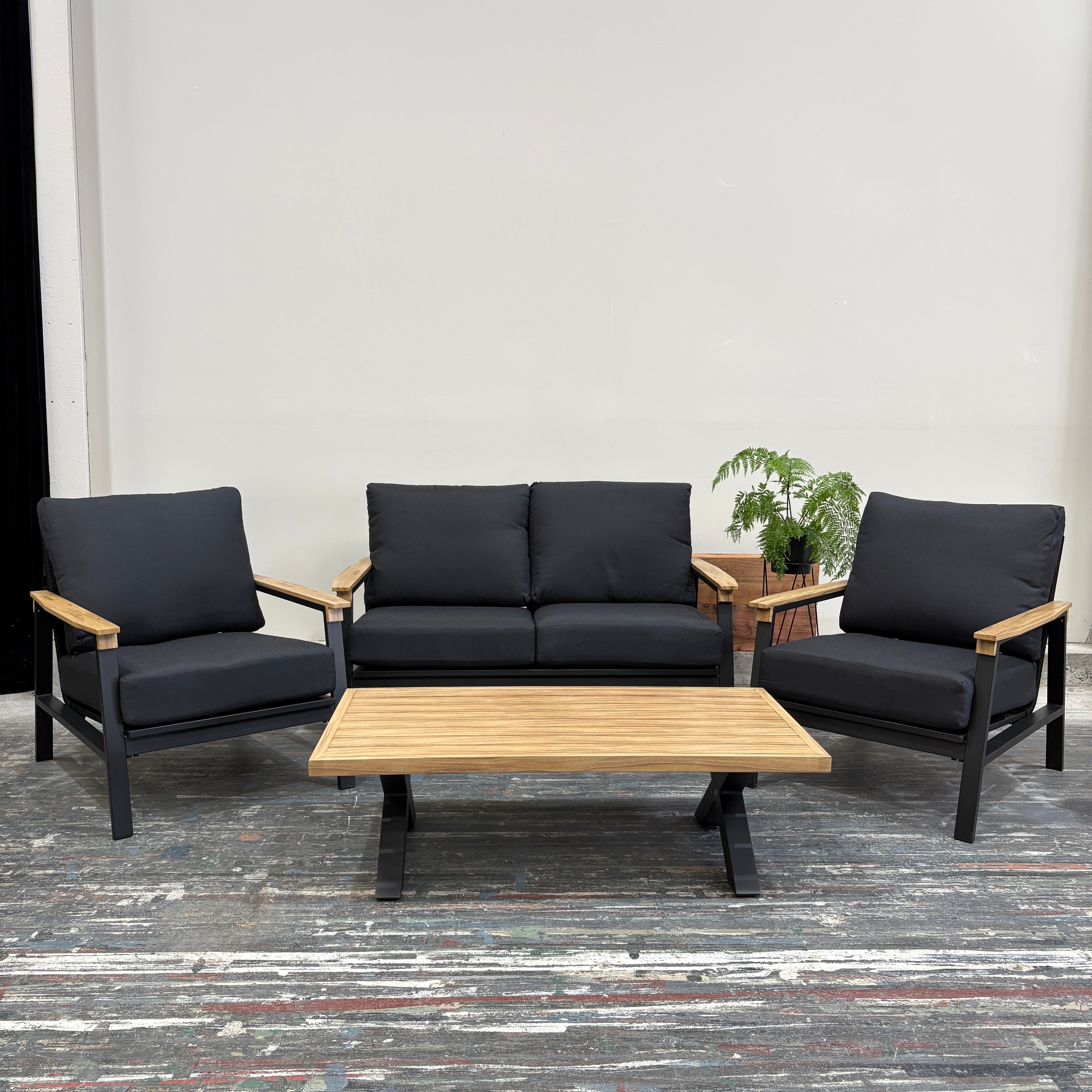 Emilie Outdoor Lounge Set – 4 Piece | Charcoal Aluminium / Black Cushions / Natural Timber-Look