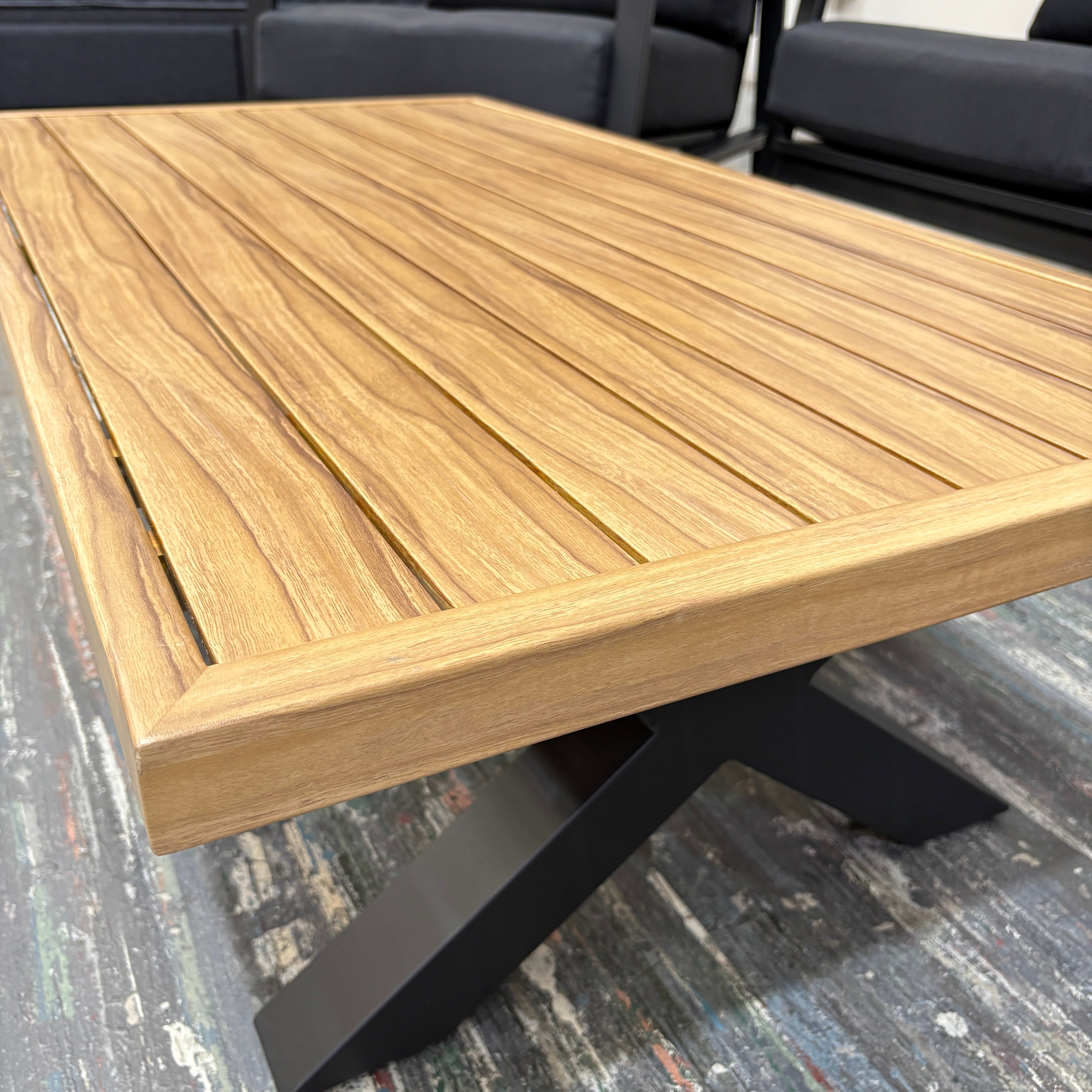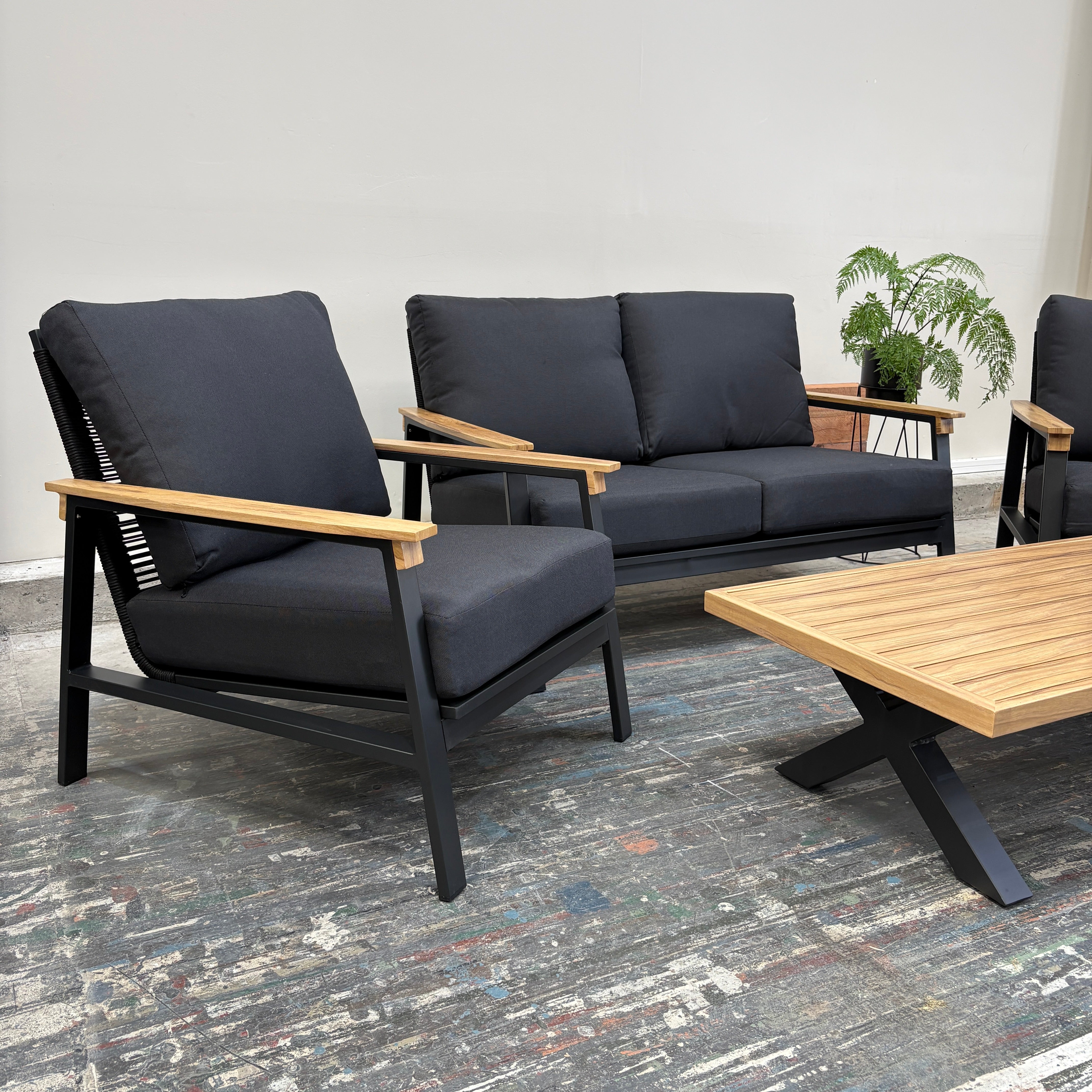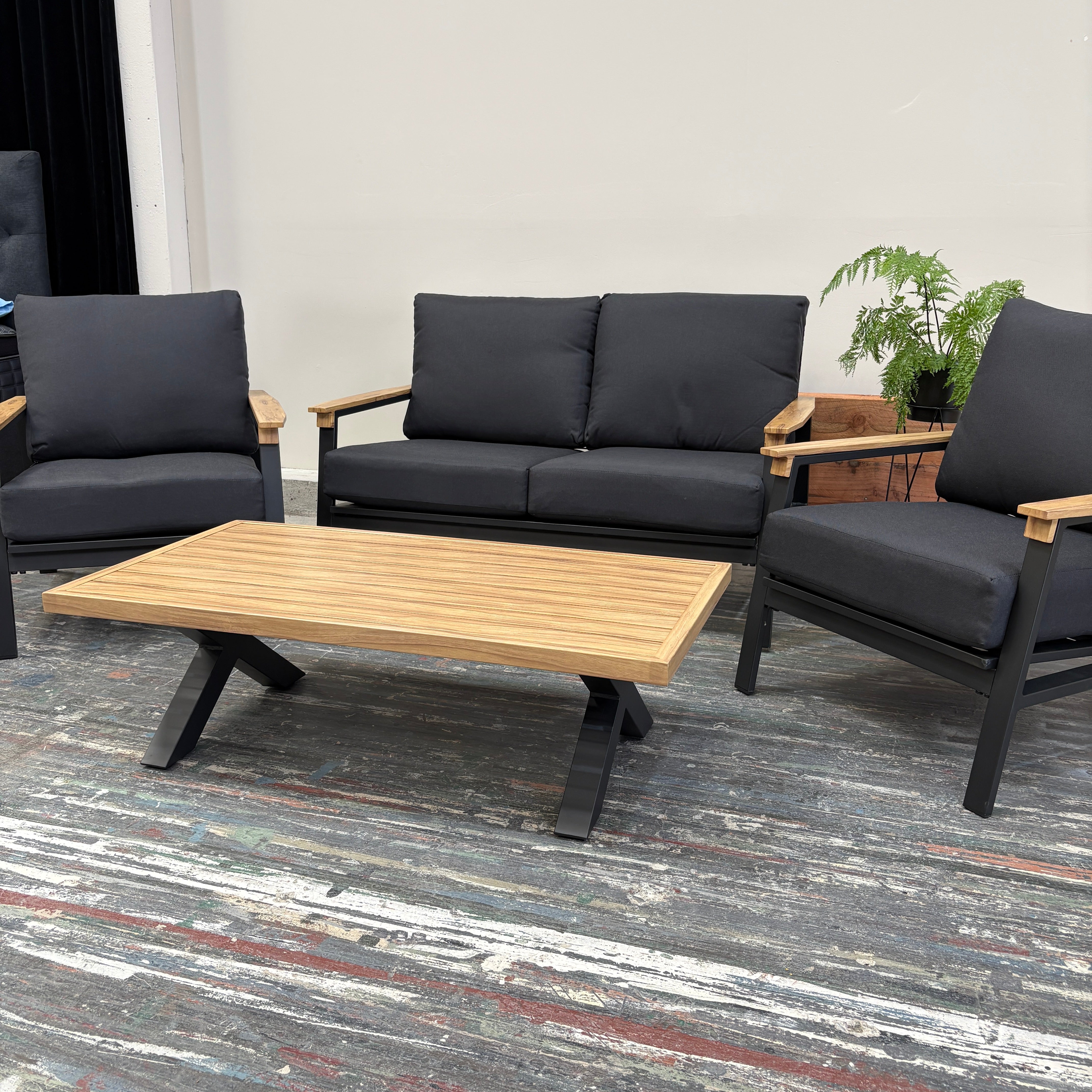 Relax in style with the Emilie Outdoor Lounge Set — a perfect balance of modern design, durable materials, and everyday comfort. Featuring a sturdy charcoal anodised aluminium frame, natural timber-look armrests, deep black cushions, and a matching slatted coffee table, it’s designed for easy outdoor living — from lazy afternoons to evening entertaining.