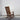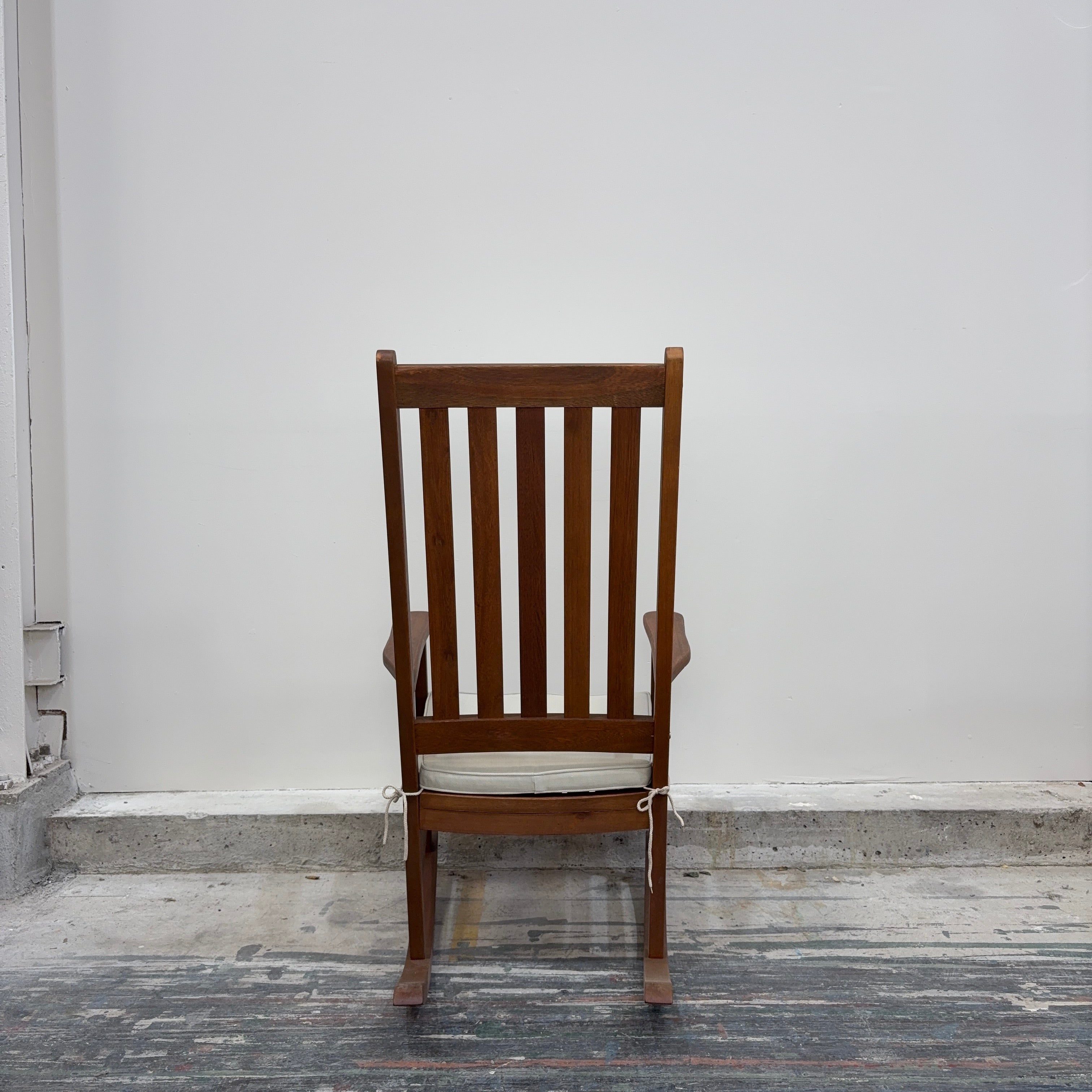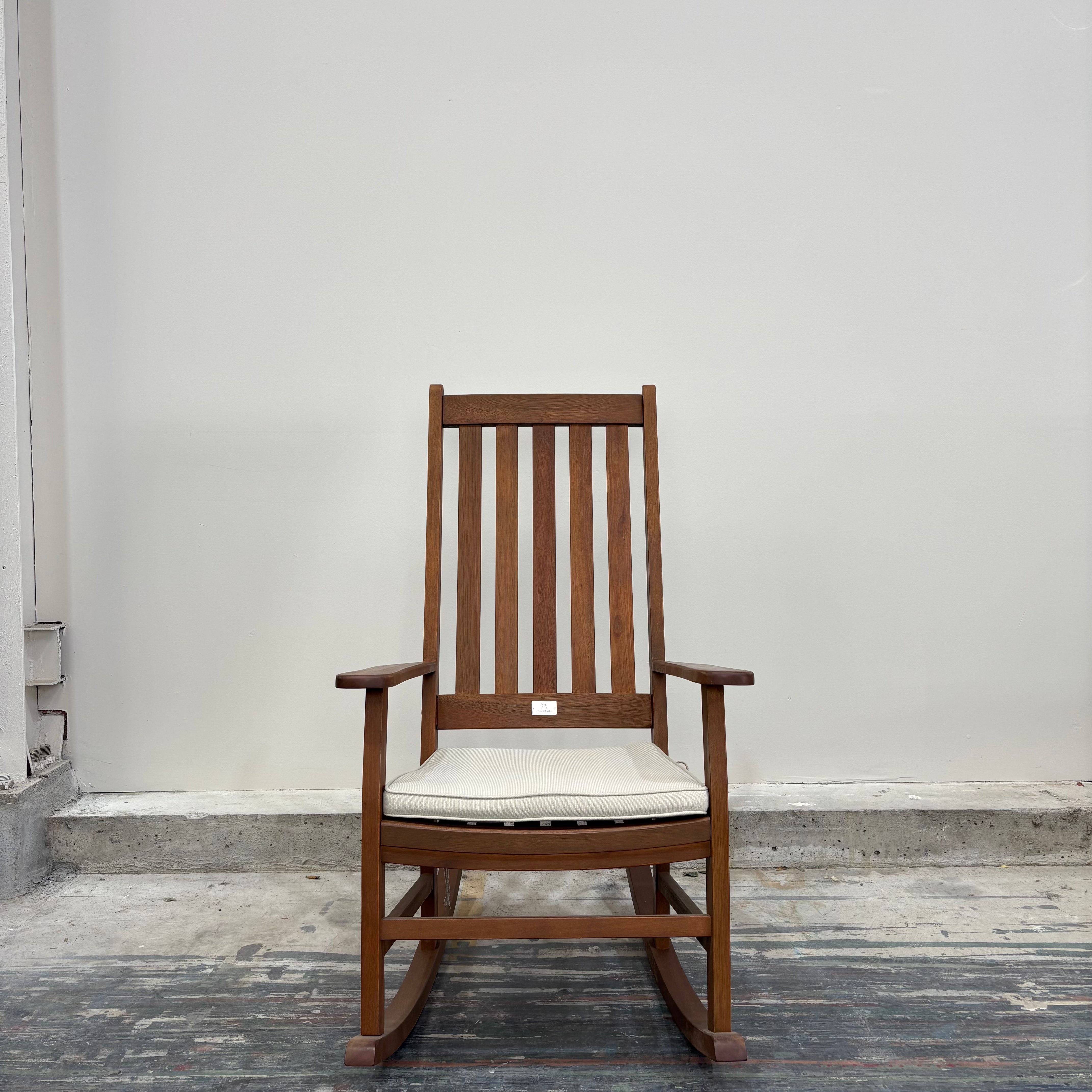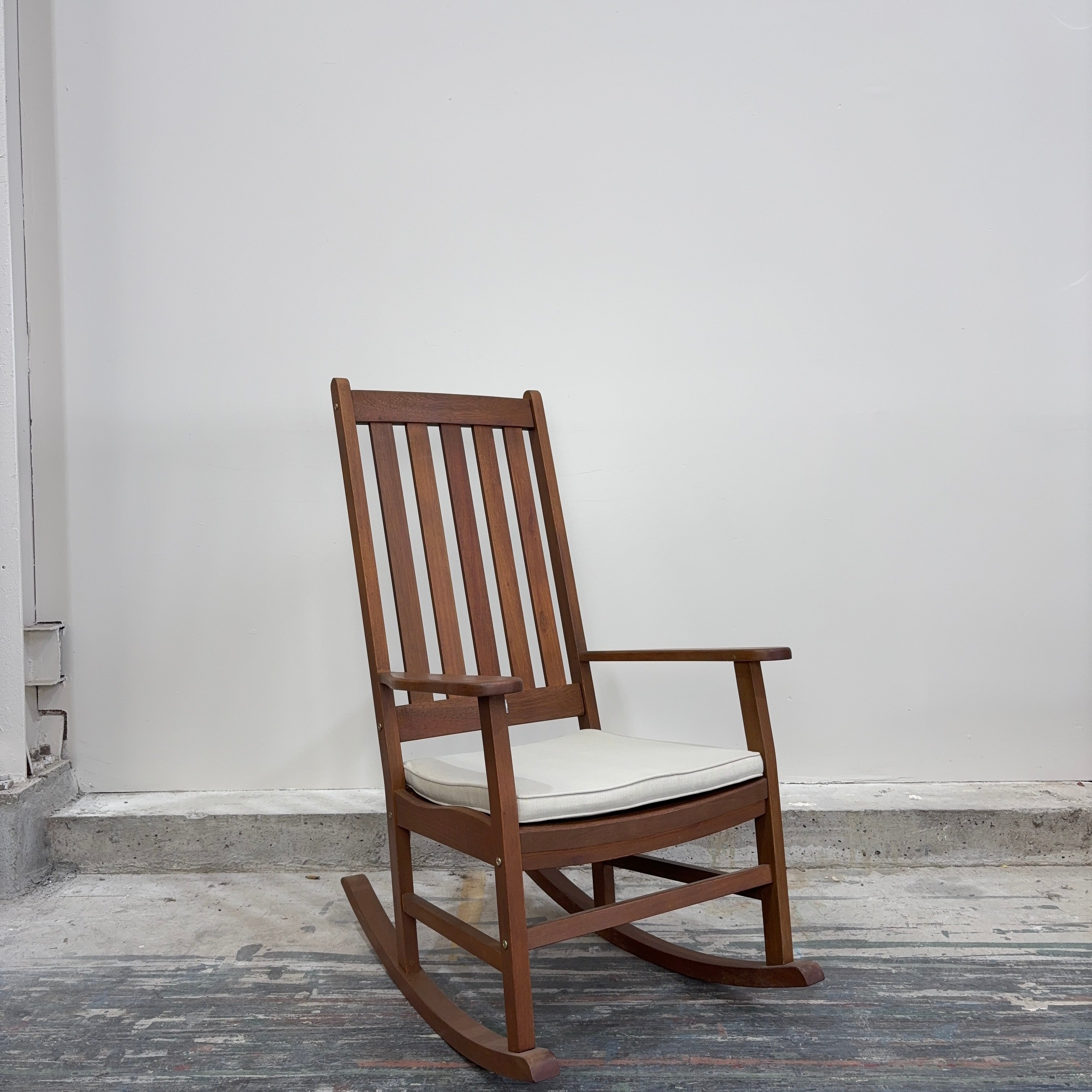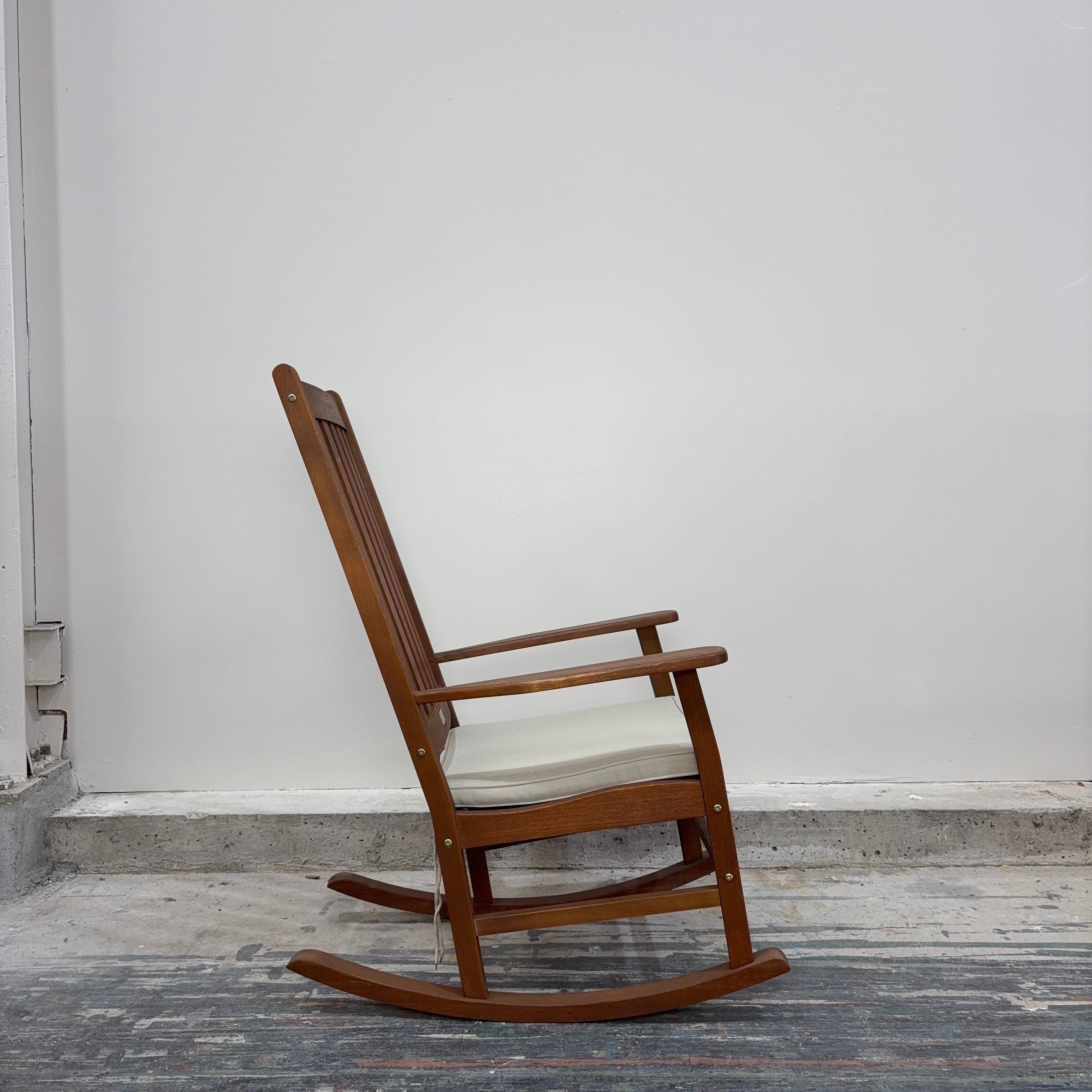 Wooden rocking chair with a white cushion on a gray carpeted floor