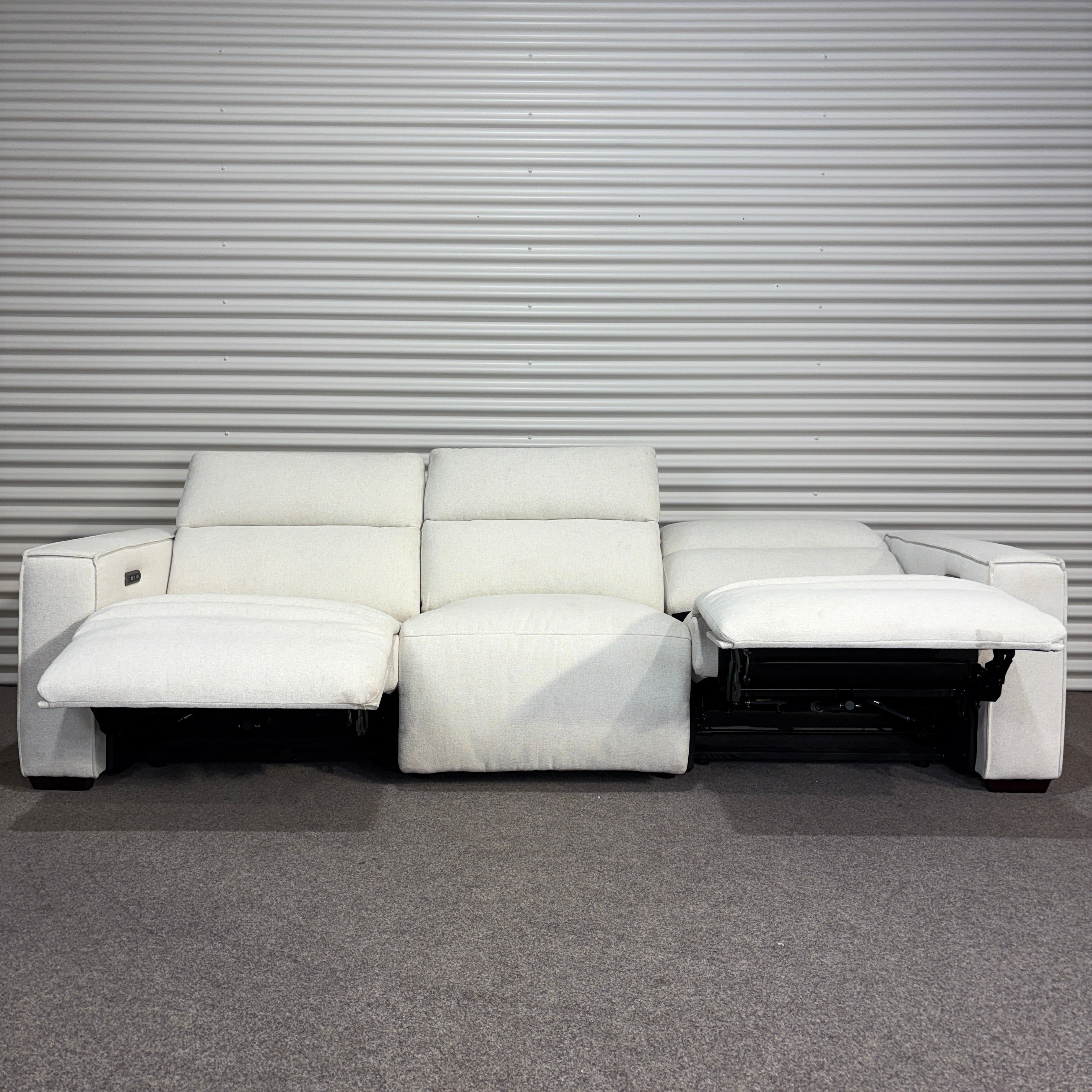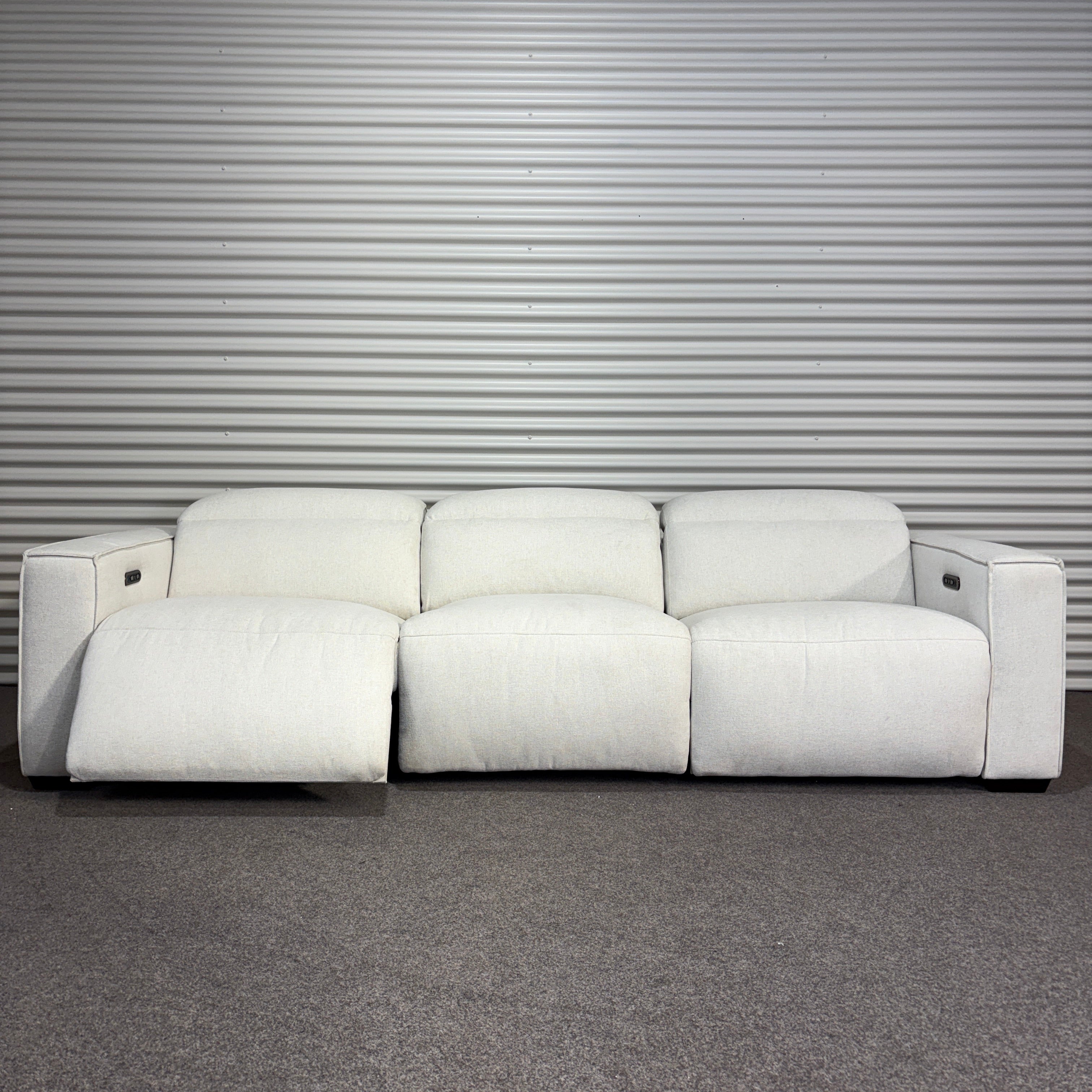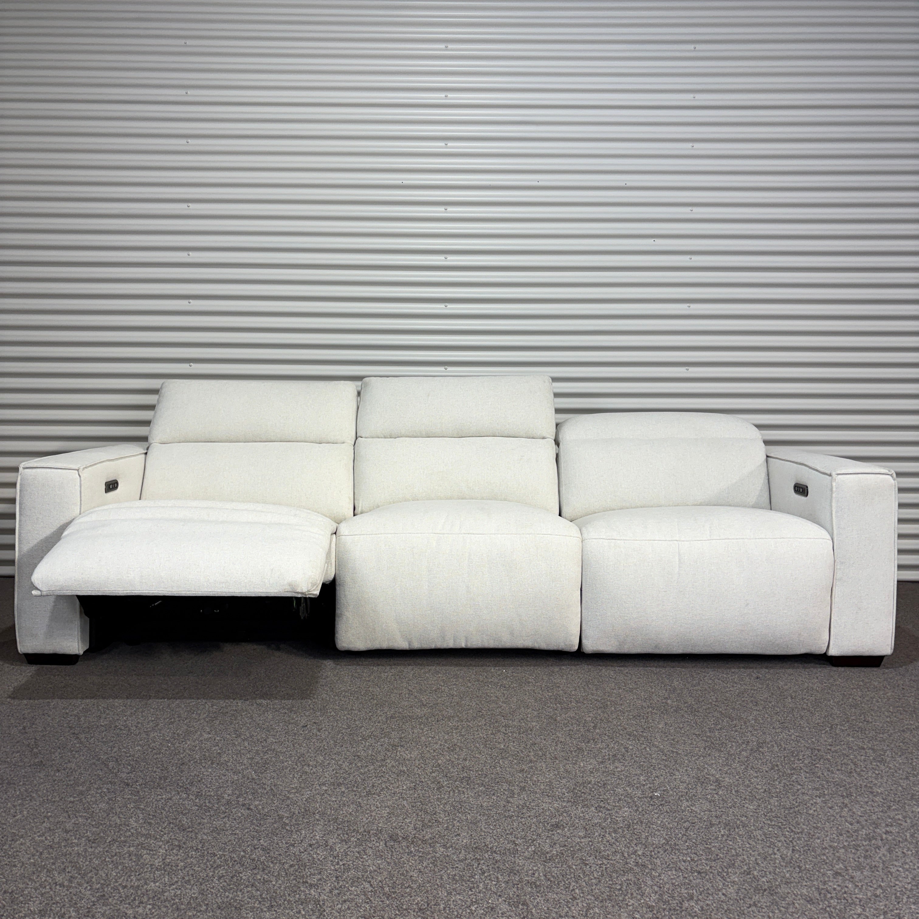Settle into the Lucent 3-Seater Recliner Sofa – a clean-lined design that combines comfort with modern simplicity. Upholstered in soft white fabric, it pairs powered recliners with a low-profile silhouette, offering an easy balance of style and relaxation.