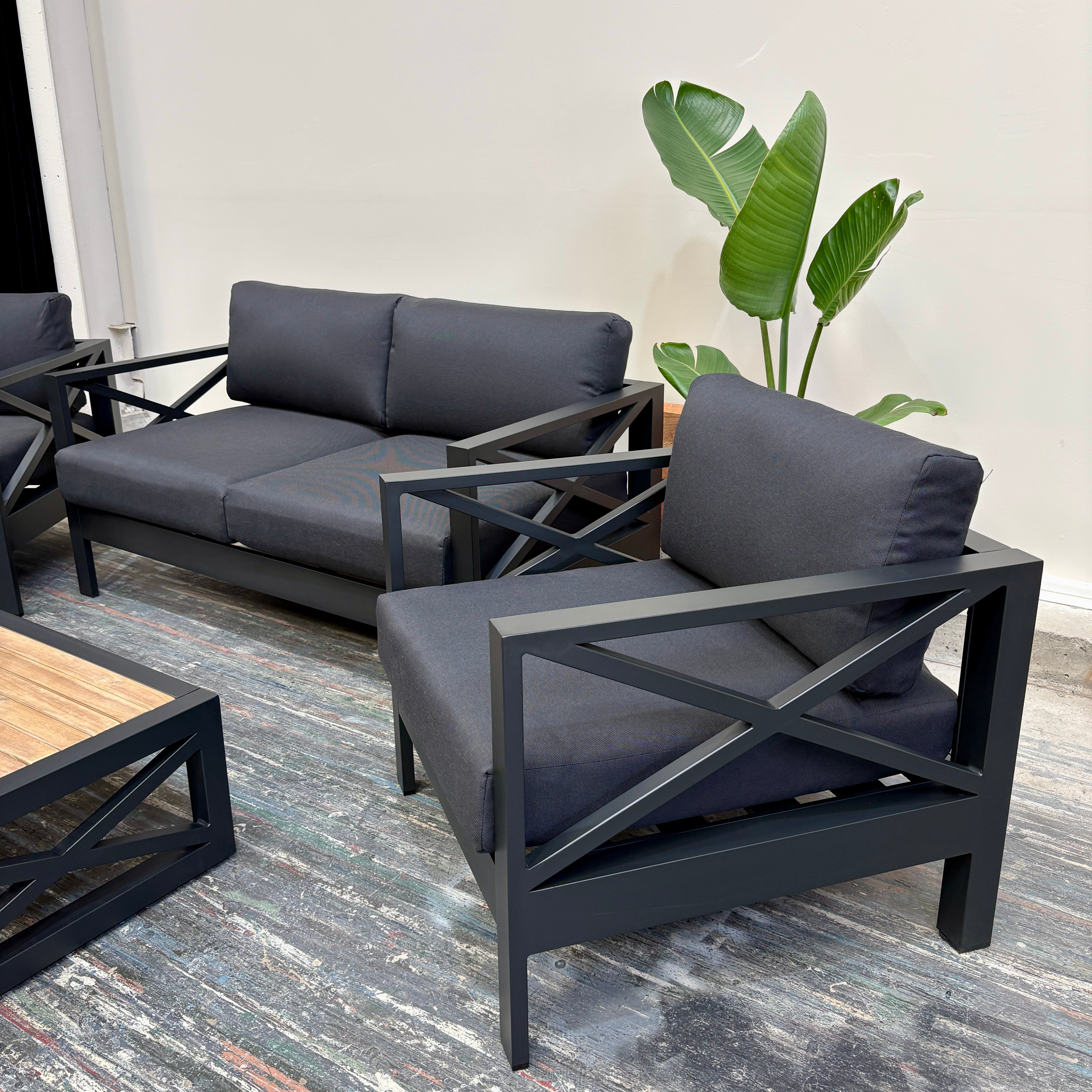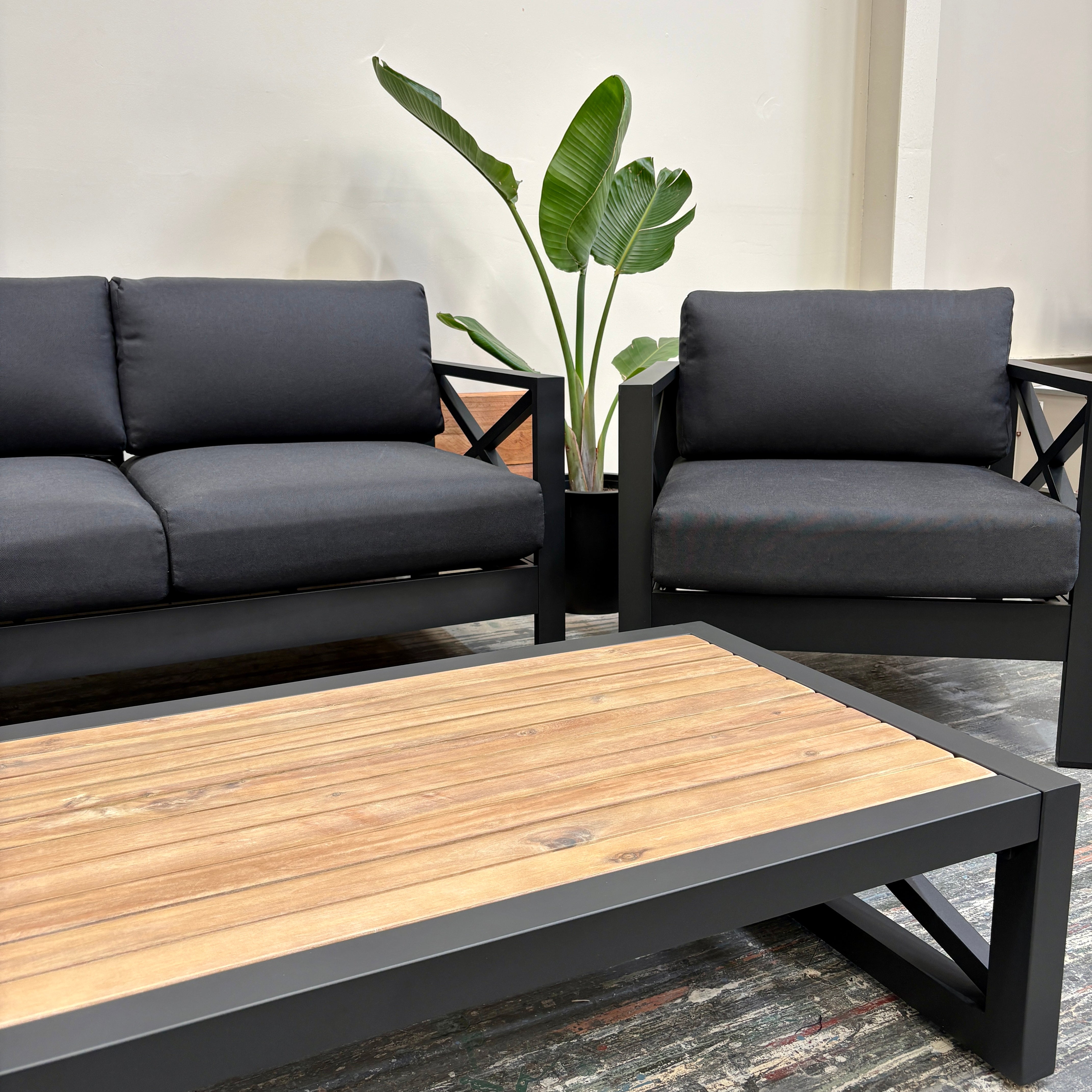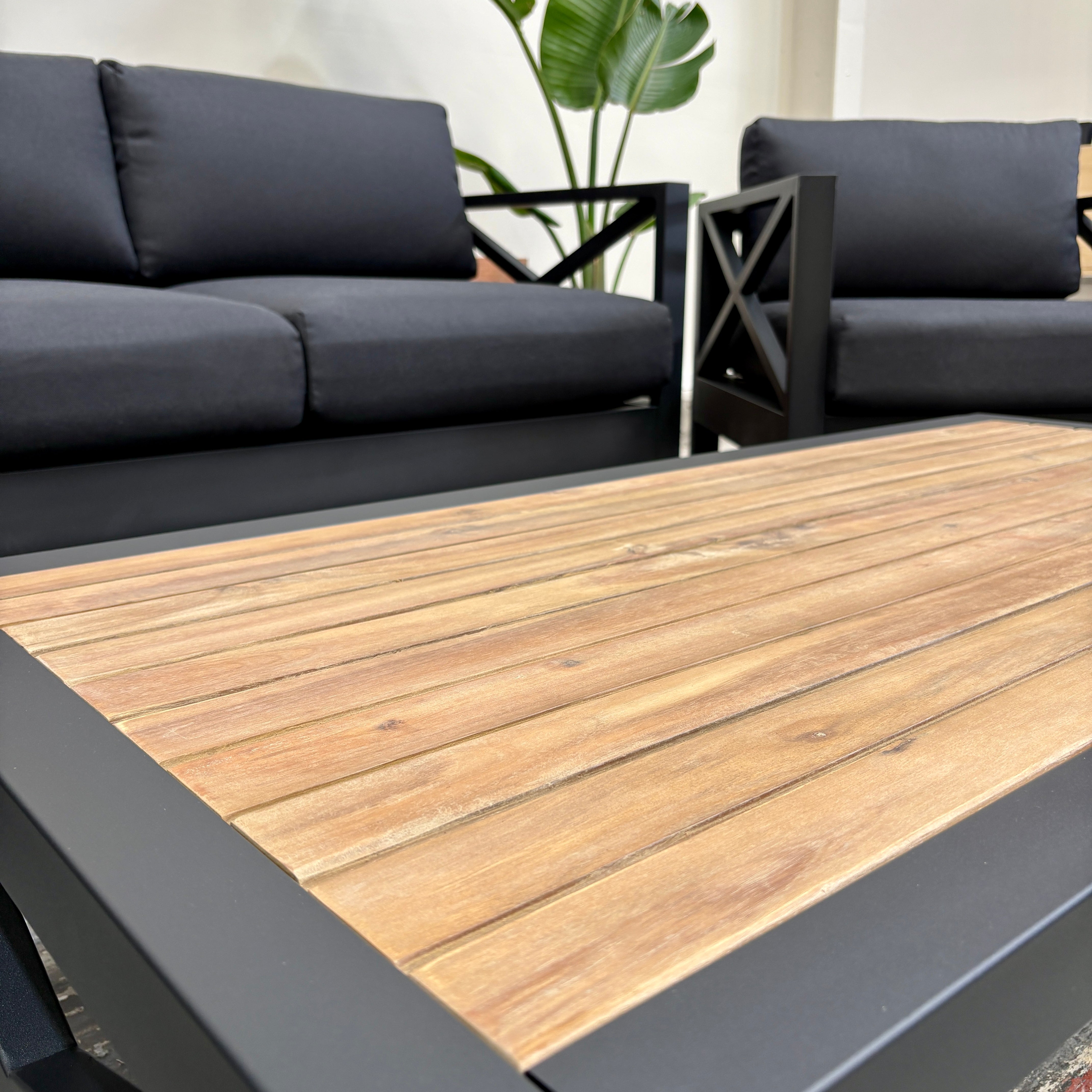 Create the ultimate outdoor retreat with the Mia II Outdoor Lounge Set. Featuring a sleek matte black anodised aluminium frame, plush charcoal cushions, and a timber-look slatted coffee table, this 4-piece set blends style, comfort, and durability — perfect for entertaining or unwinding in style.