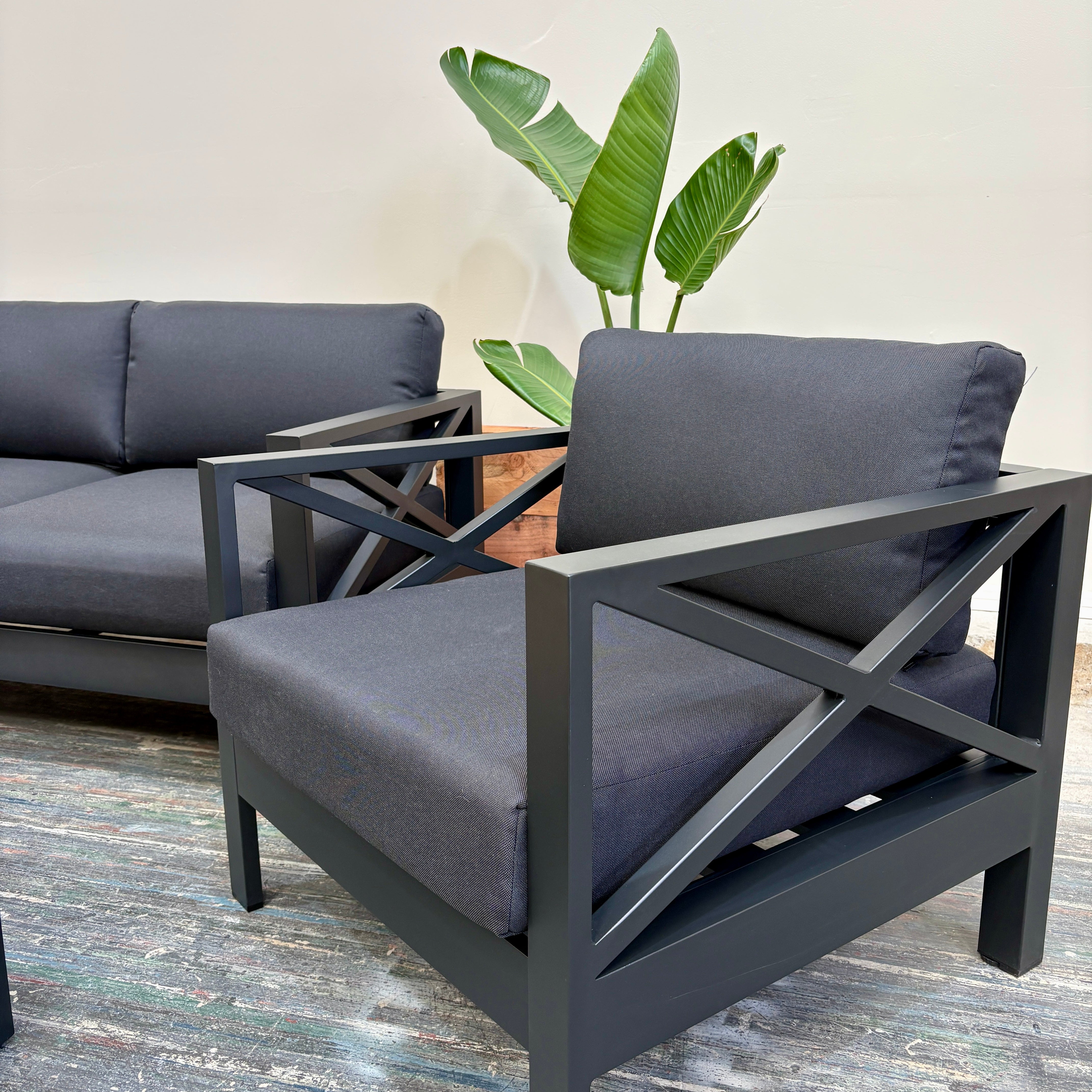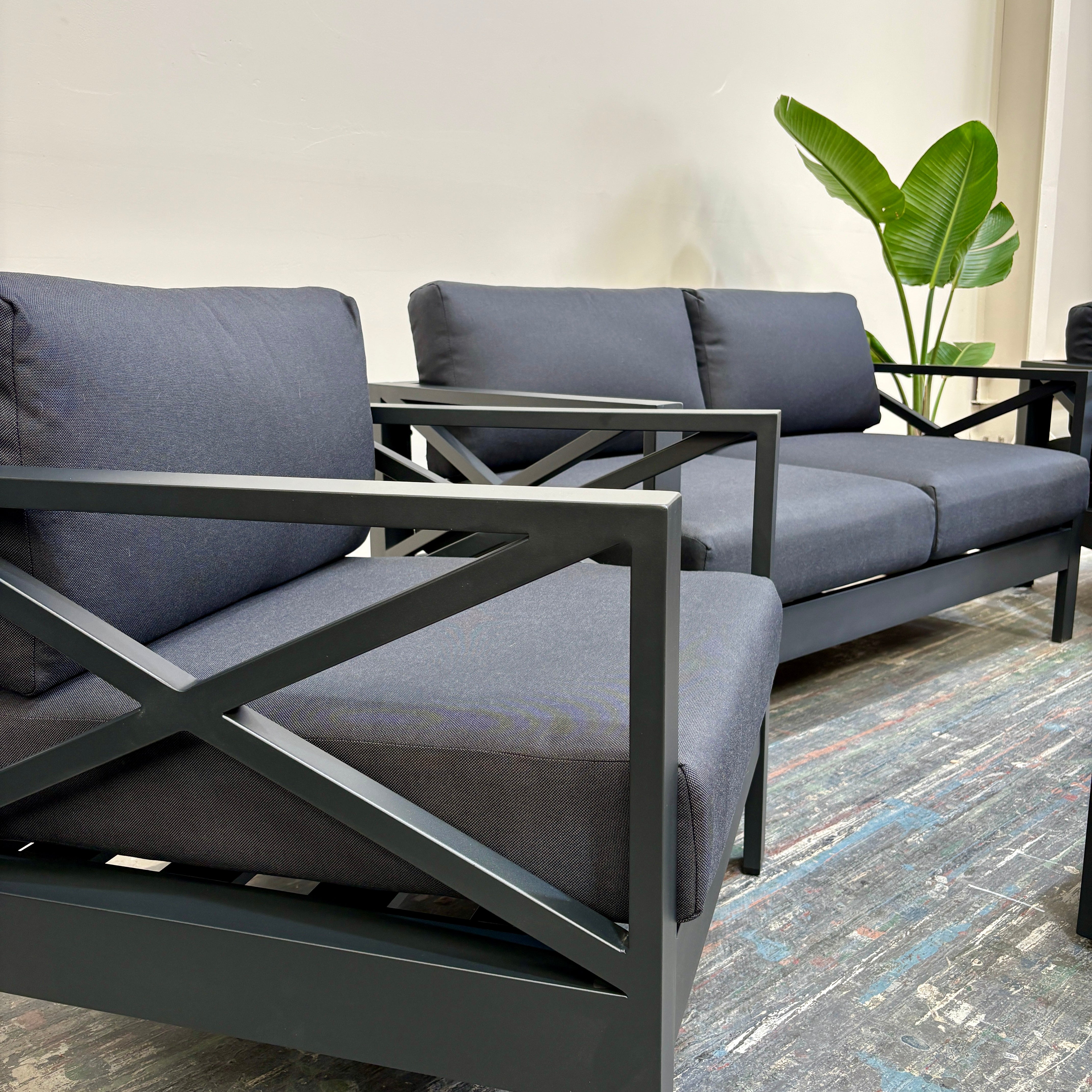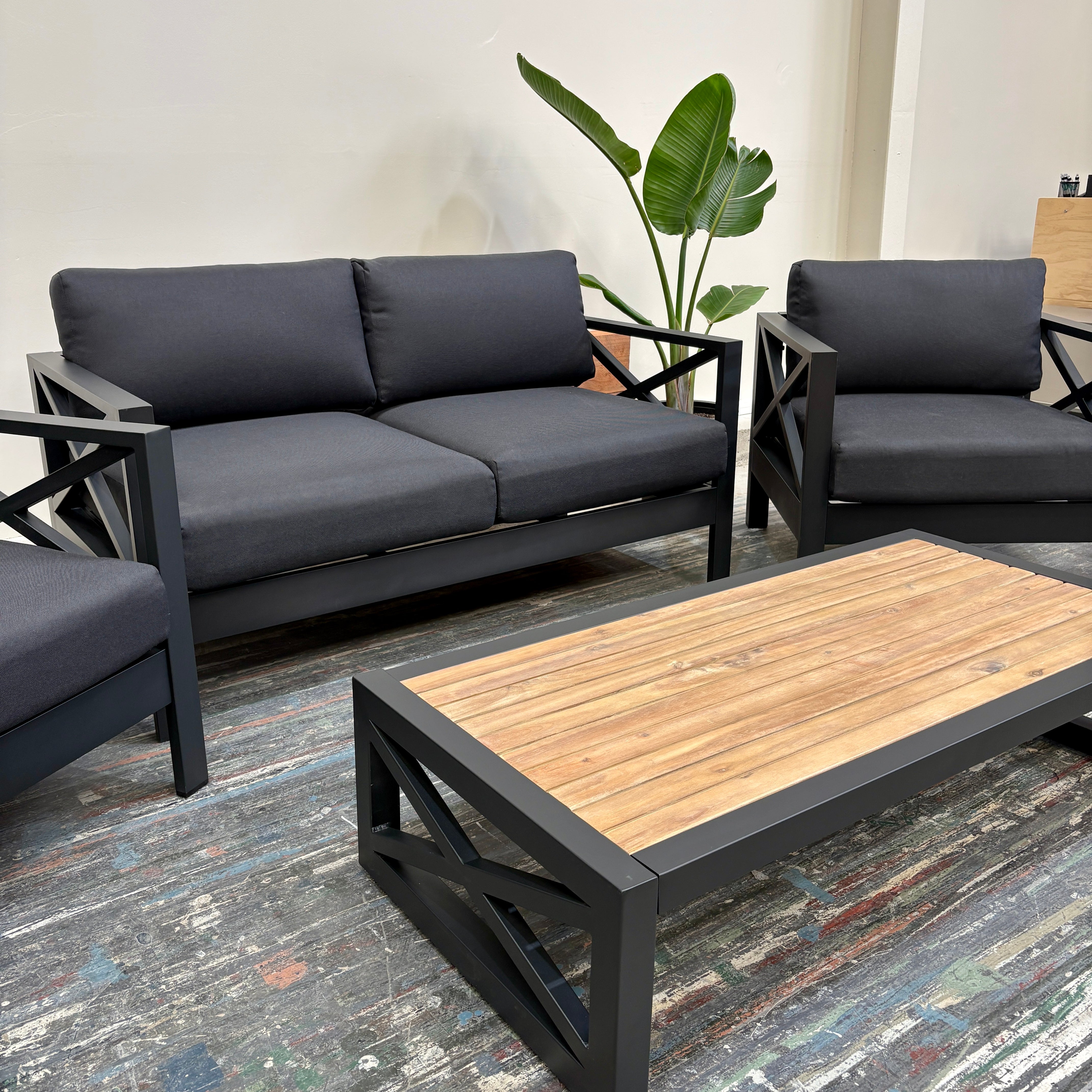 Create the ultimate outdoor retreat with the Mia II Outdoor Lounge Set. Featuring a sleek matte black anodised aluminium frame, plush charcoal cushions, and a timber-look slatted coffee table, this 4-piece set blends style, comfort, and durability — perfect for entertaining or unwinding in style.
