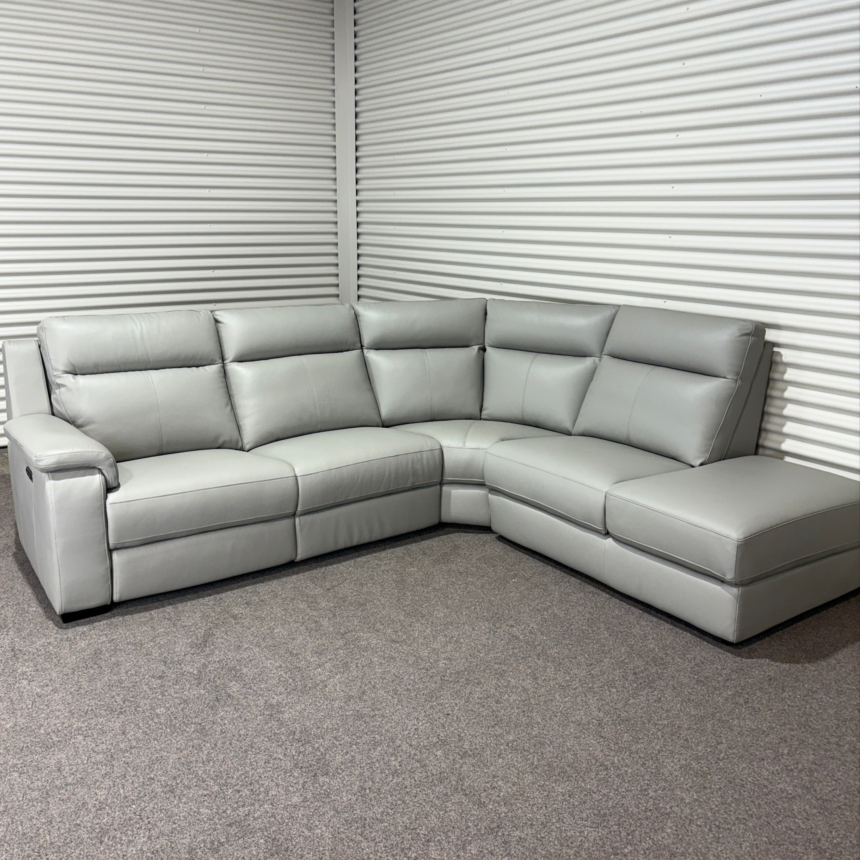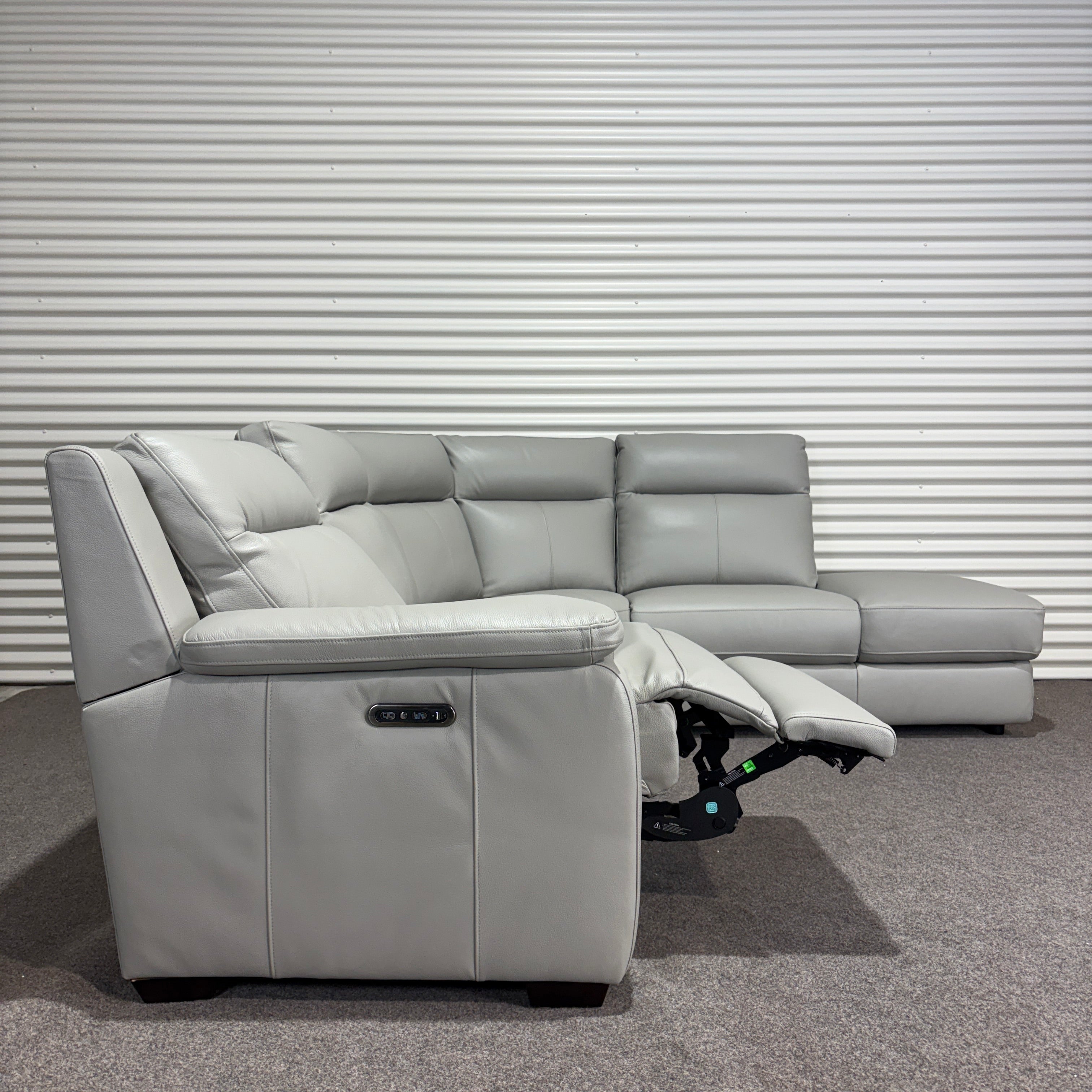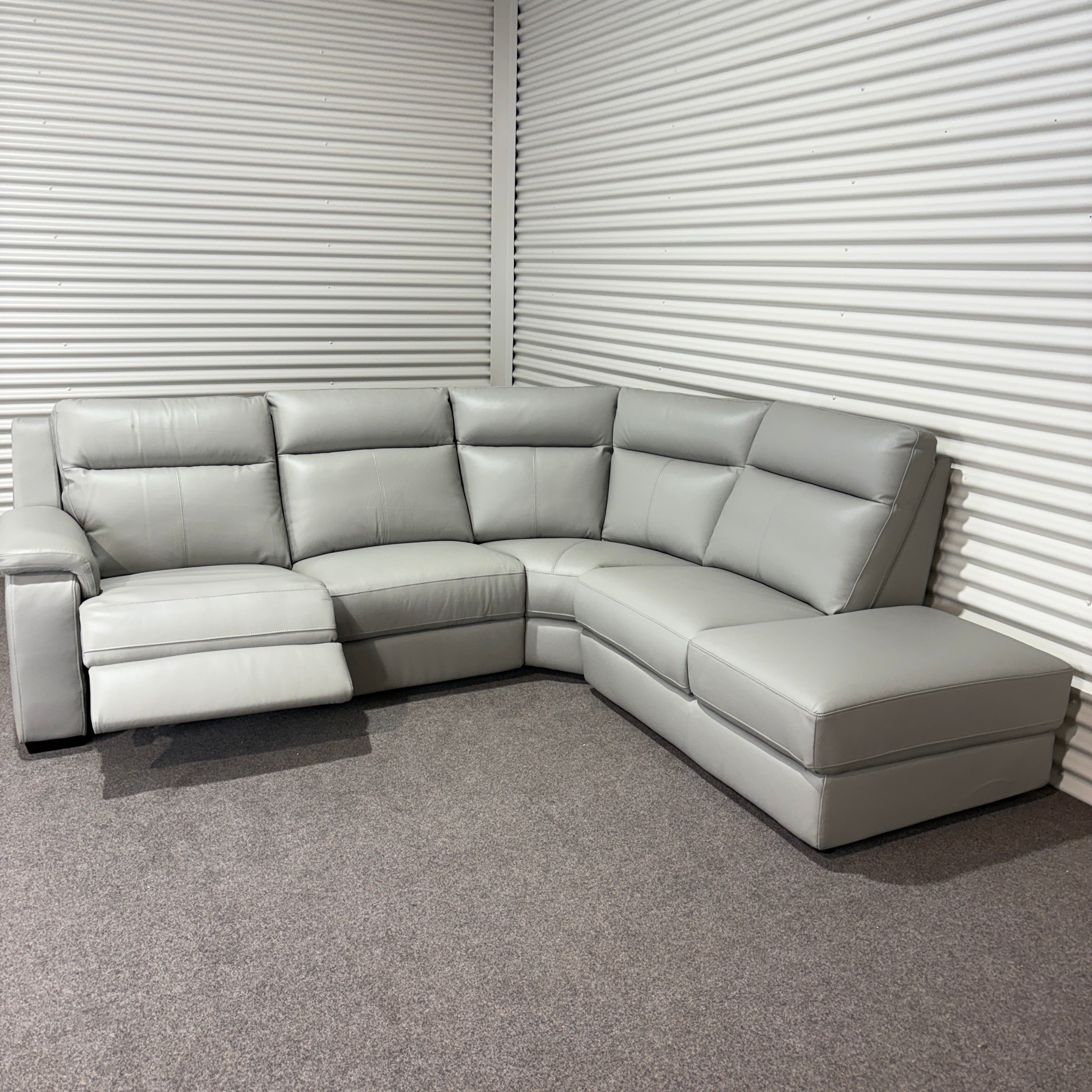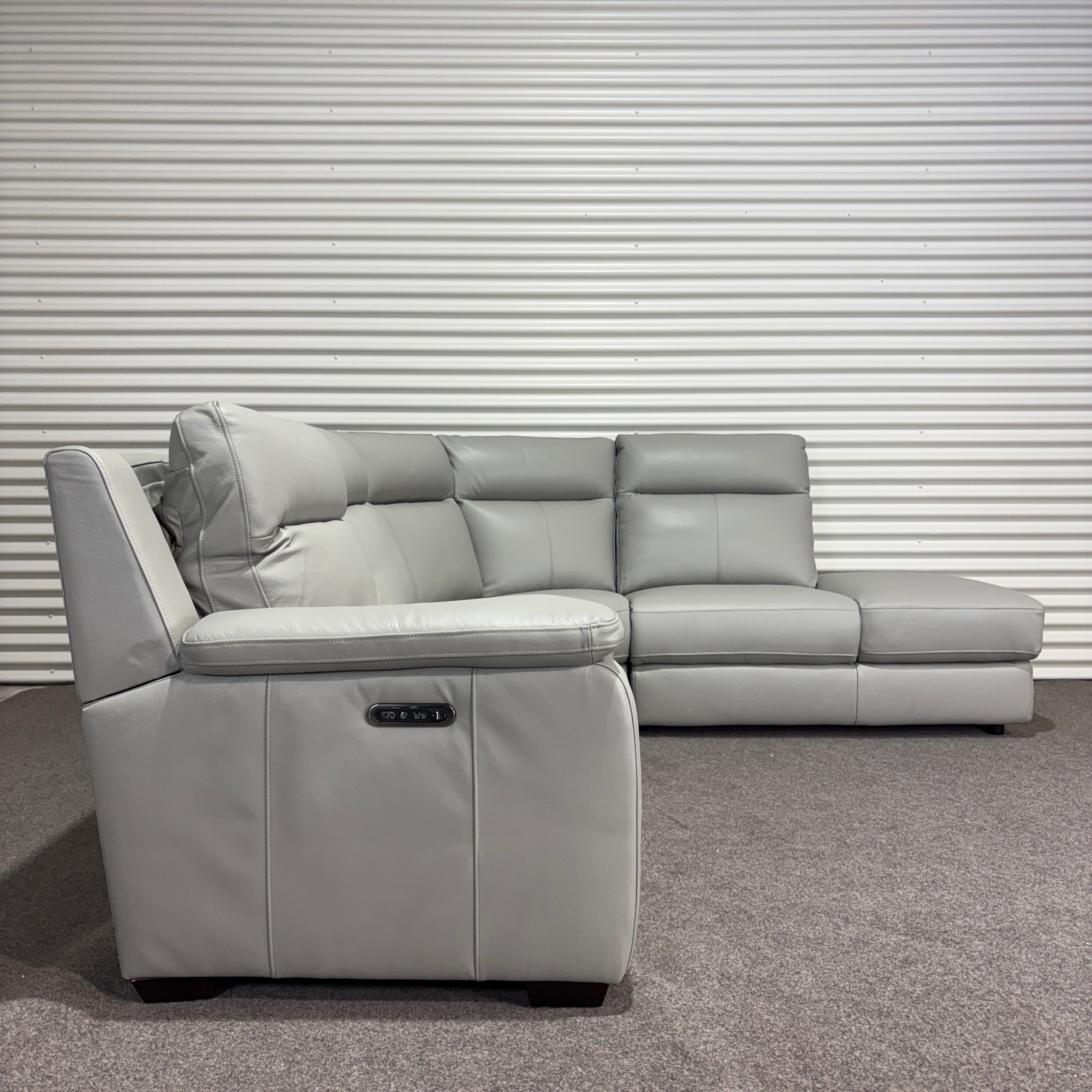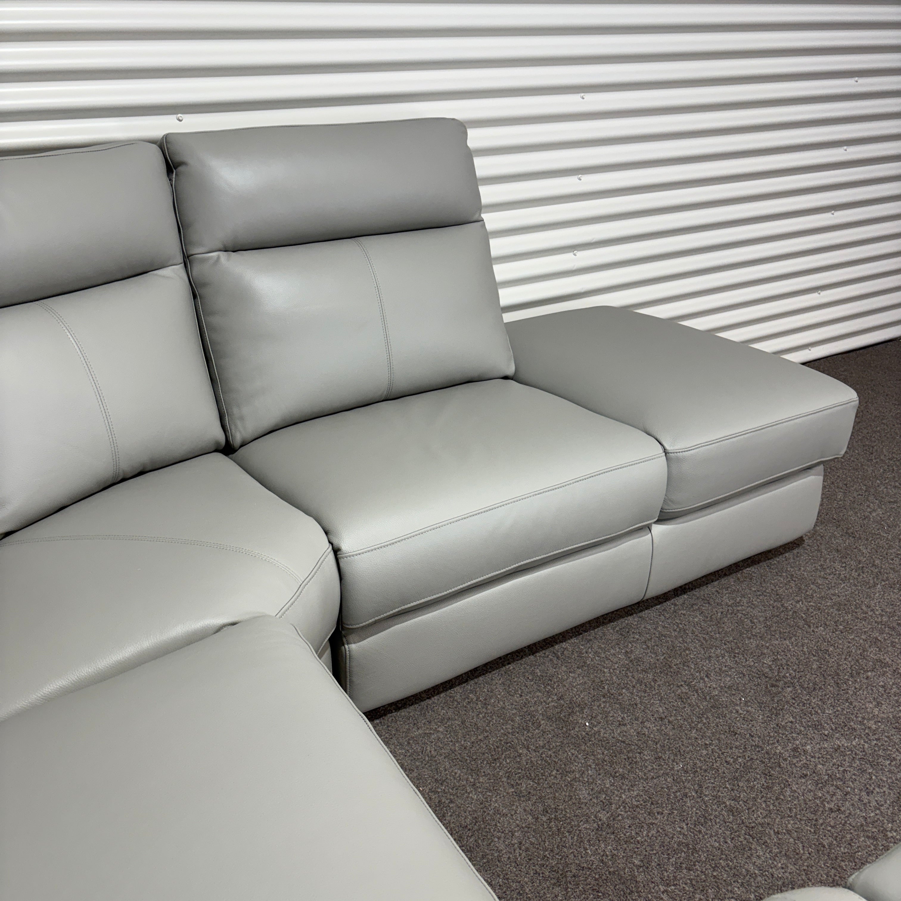 Settle into the Aveline Modular Recliner Sofa — a sleek modular recliner that combines modern leather styling with generous seating. In soft light grey leather, this corner design balances comfort and versatility, giving you powered recliners on one side and a spacious chaise on the other. Perfect for relaxing, stretching out, or entertaining.