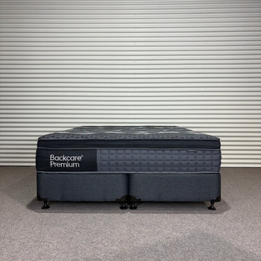 Front view of Backcare Premium mattress with matching base showing grey quilted top, dark upholstered sides, standard legs and branded side panel against corrugated backdrop.