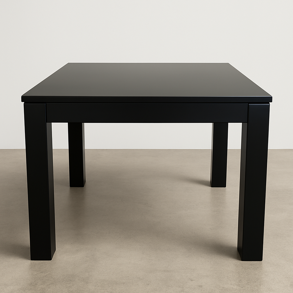 A sturdy and stylish dining set perfect for everyday family use. This 1000mm × 1000mm square black dining table now comes as a complete set with four matching slat-back chairs. Finished in a rich matte black, the set blends seamlessly into both modern and classic homes. Strong, durable, and easy to clean, it’s ideal for apartments, dining rooms, and kitchen spaces.