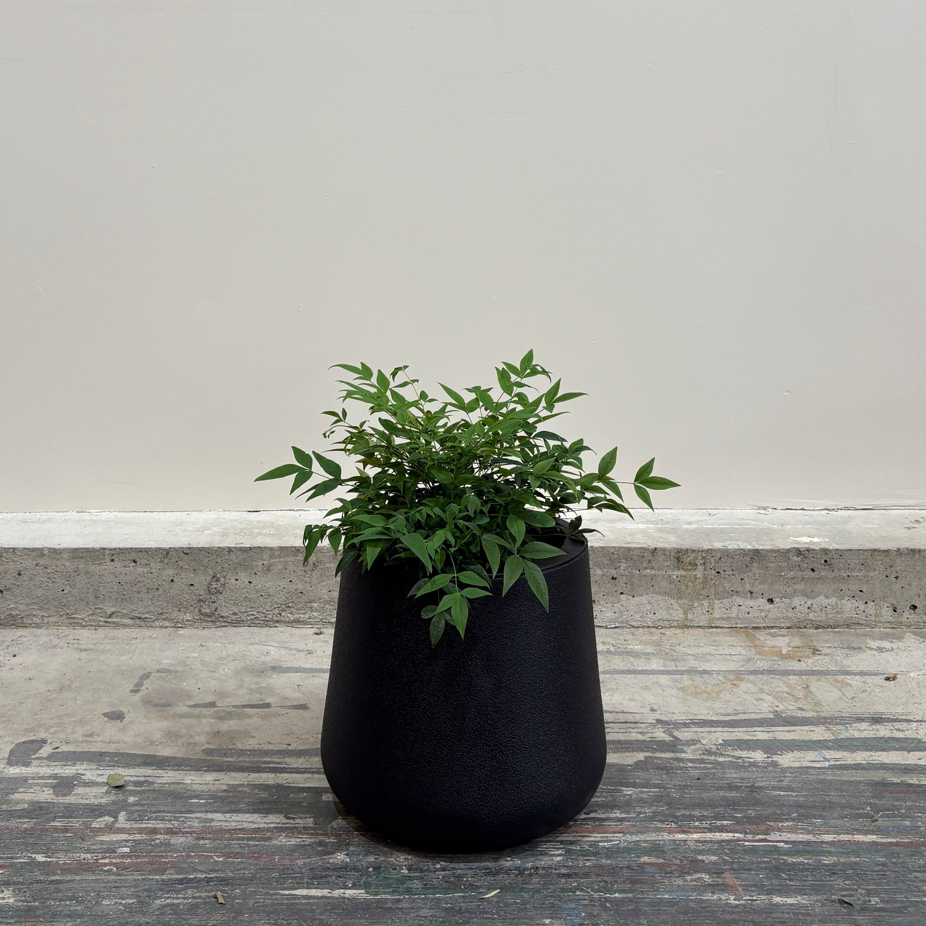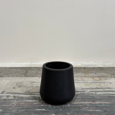 Black cylindrical pot with a green plant on a wooden surface against a white wall