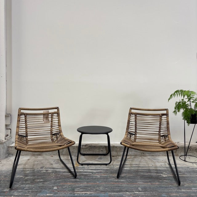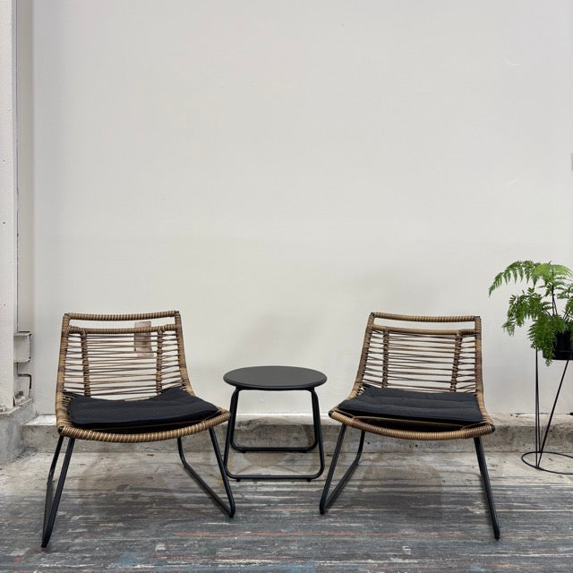Transform your patio, deck, or balcony into a stylish retreat with the Excalibur Tuscany 3-Piece Patio Set. Featuring a warm natural rattan look and a sleek black metal frame, this compact set combines timeless design with everyday comfort — perfect for morning coffees, evening drinks, or weekend lounging.