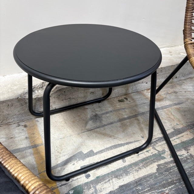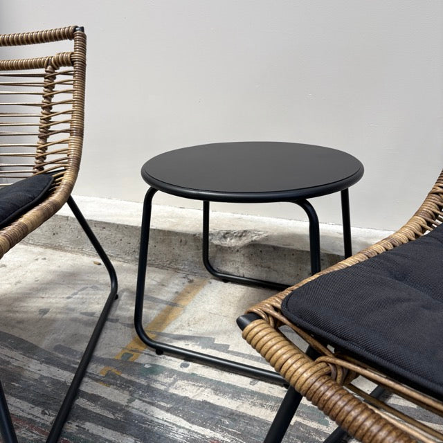 - 3-Piece Outdoor Set: Includes two rattan-look chairs with plush black cushions and one matching round side table.