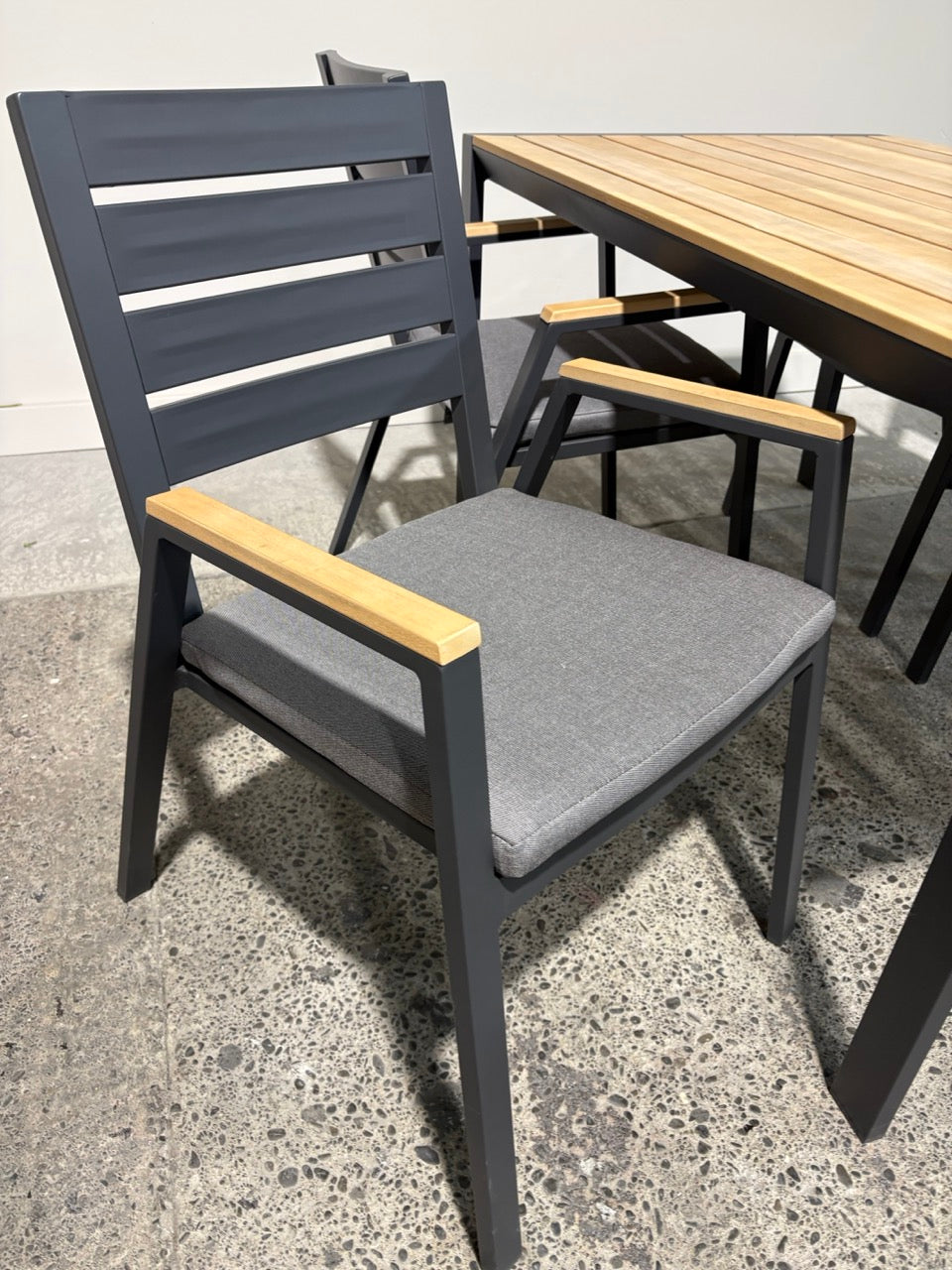 This modern 5-piece ensemble blends natural warmth with industrial durability – perfect for alfresco dinners, long summer lunches, or relaxed weekend entertaining. The timber-look tabletop contrasts beautifully with the charcoal aluminium frame, while the light-grey cushions add comfort and style for any outdoor space.