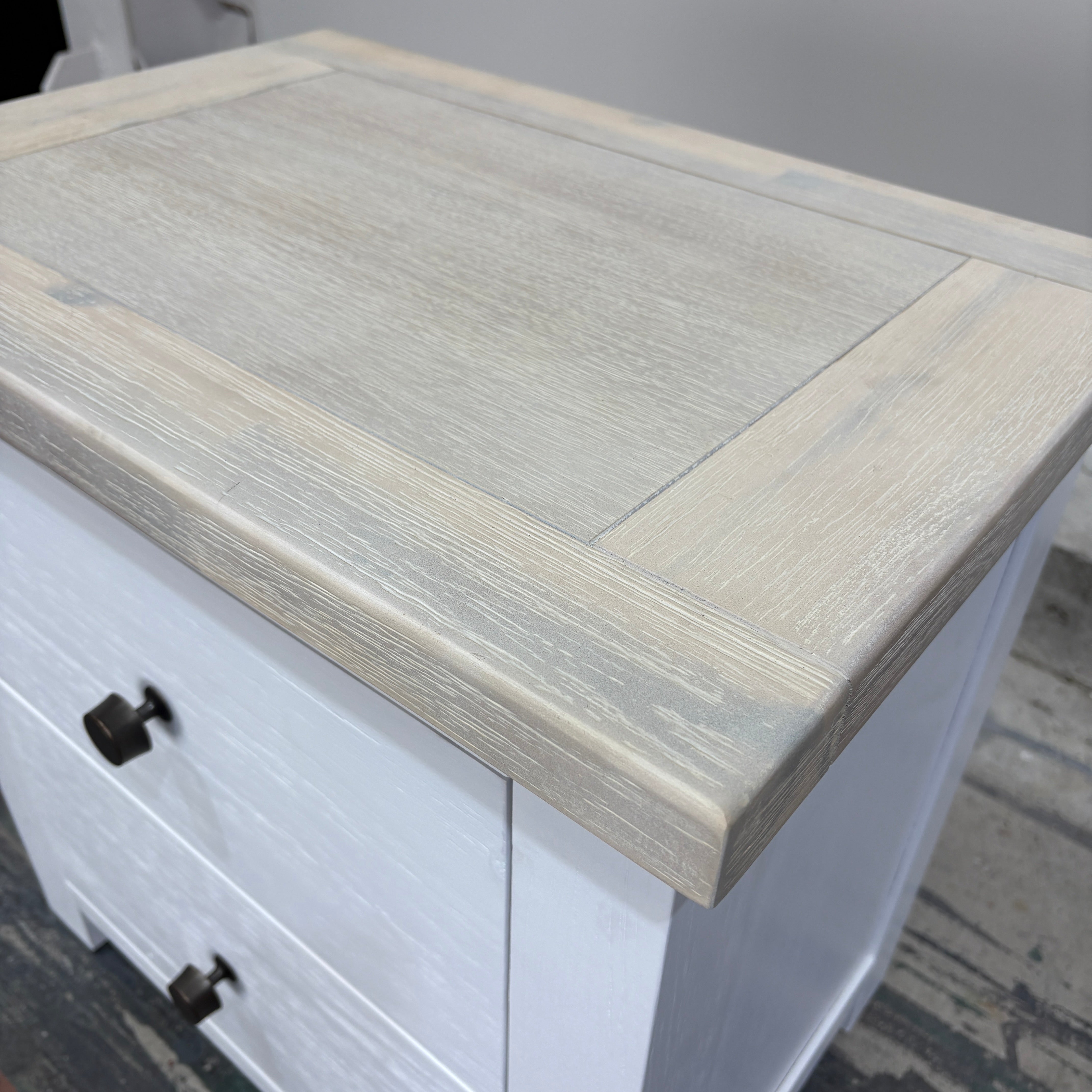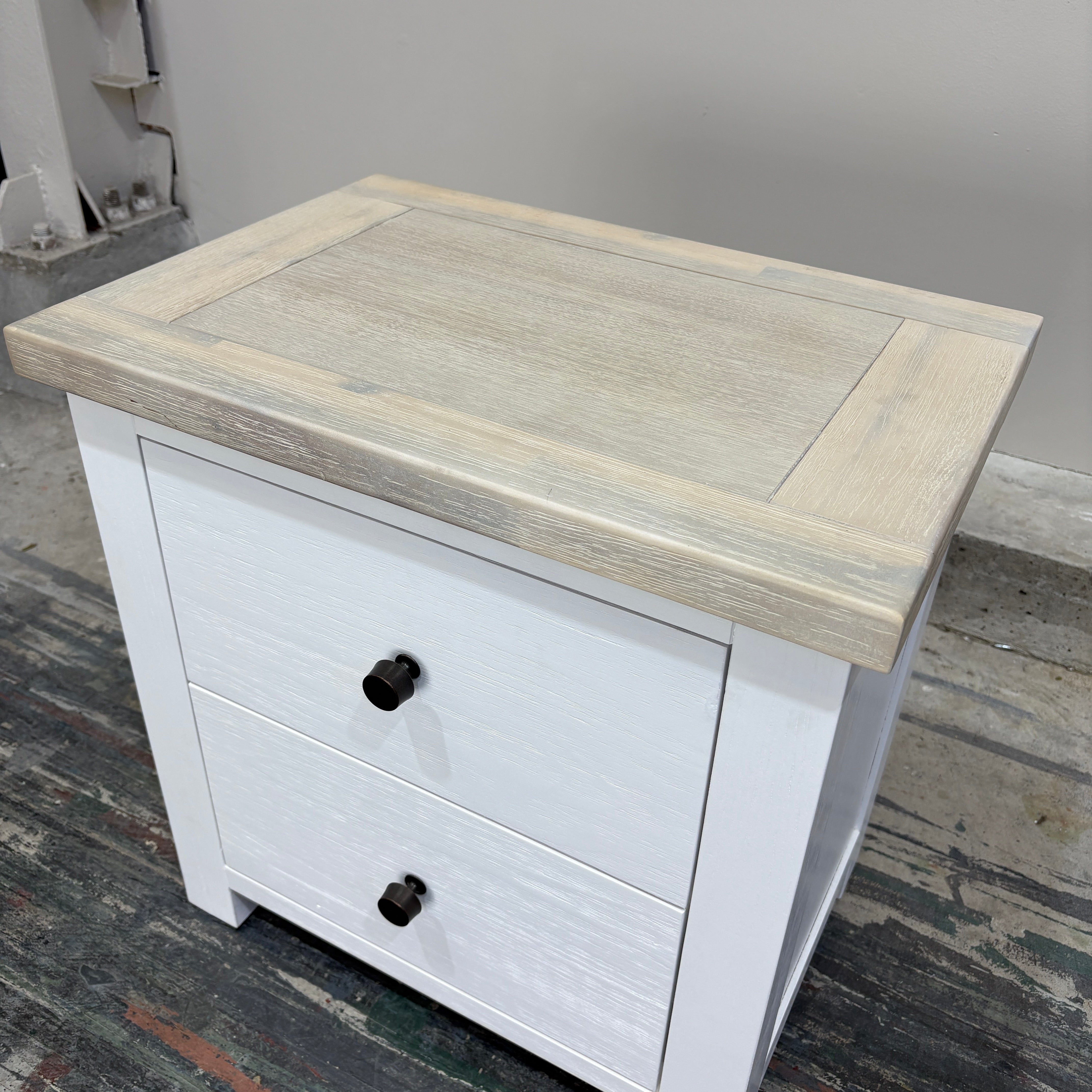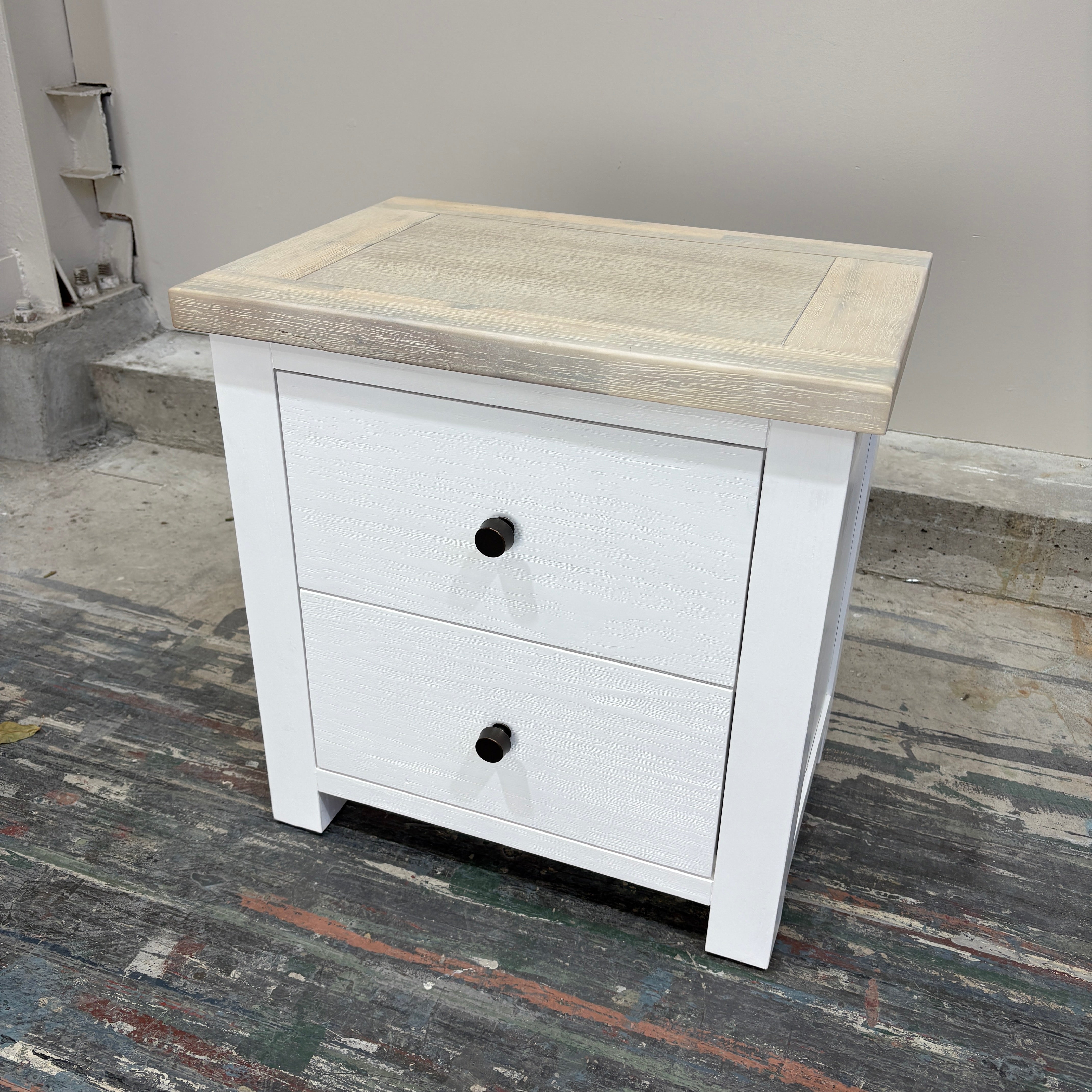 Add a touch of coastal charm to your living space with the Kinloch Bedside Cabinet. With its clean white finish and subtle rustic woodgrain top, this compact 2 drawer cabinet offers both visual appeal and everyday practicality. It delivers understated elegance and useful storage.