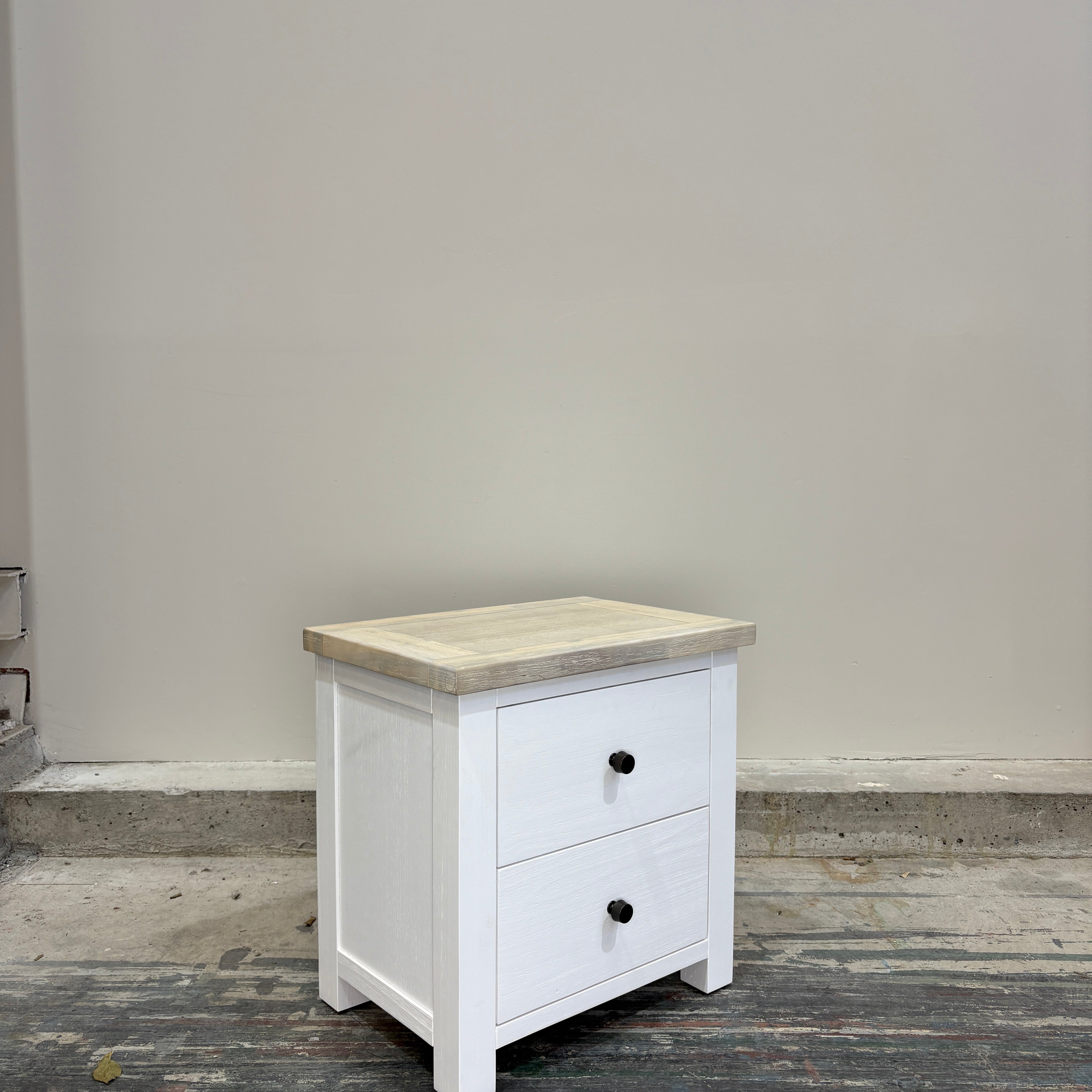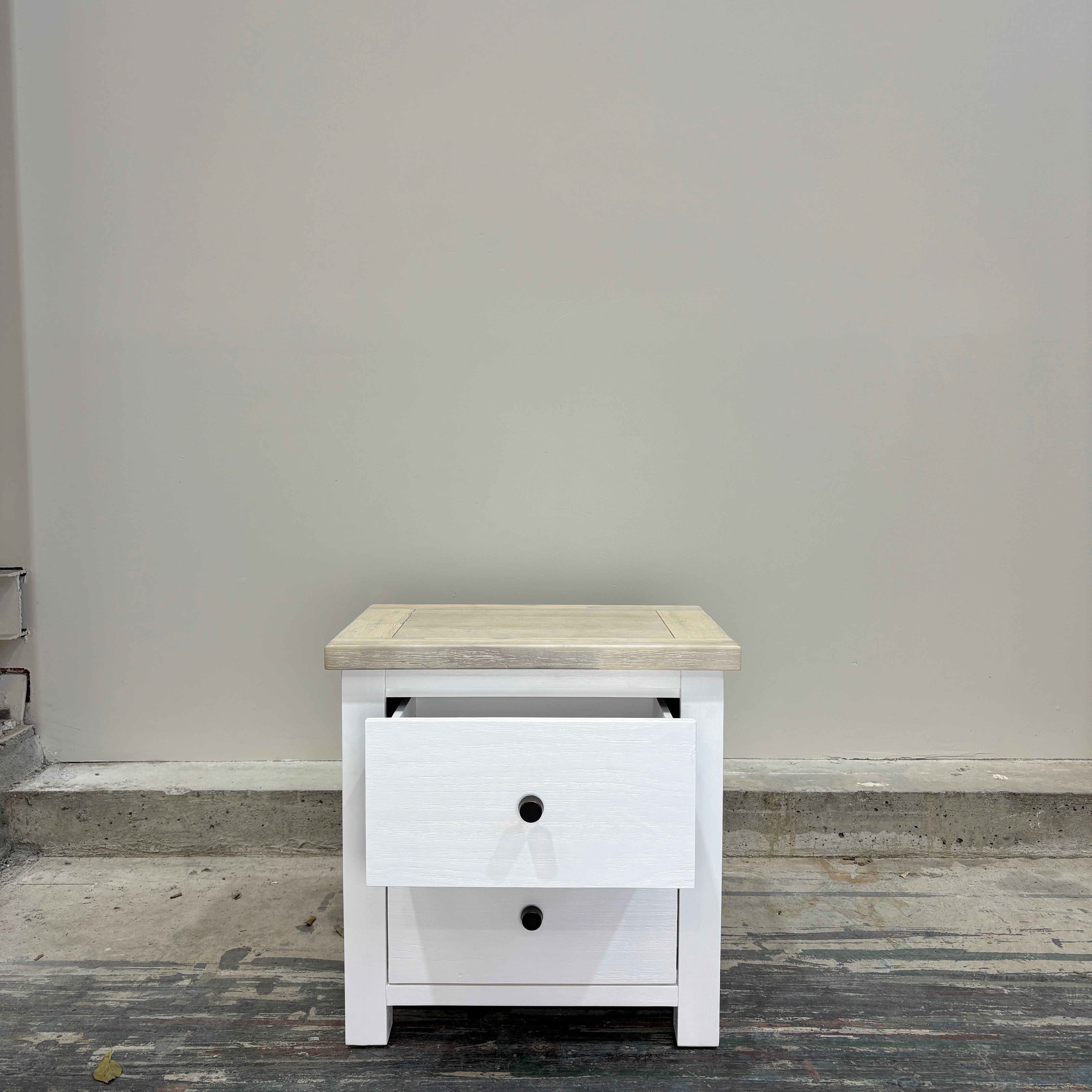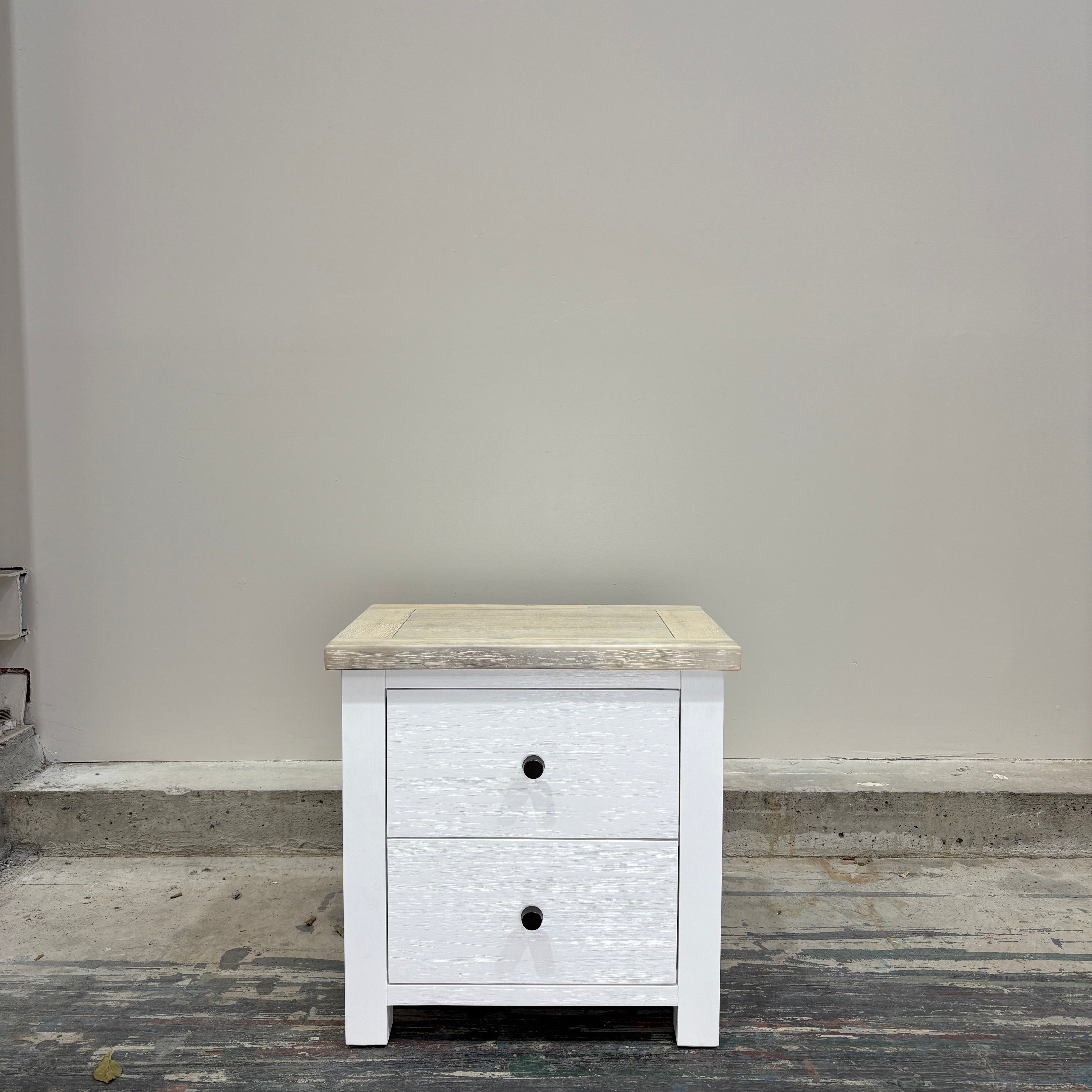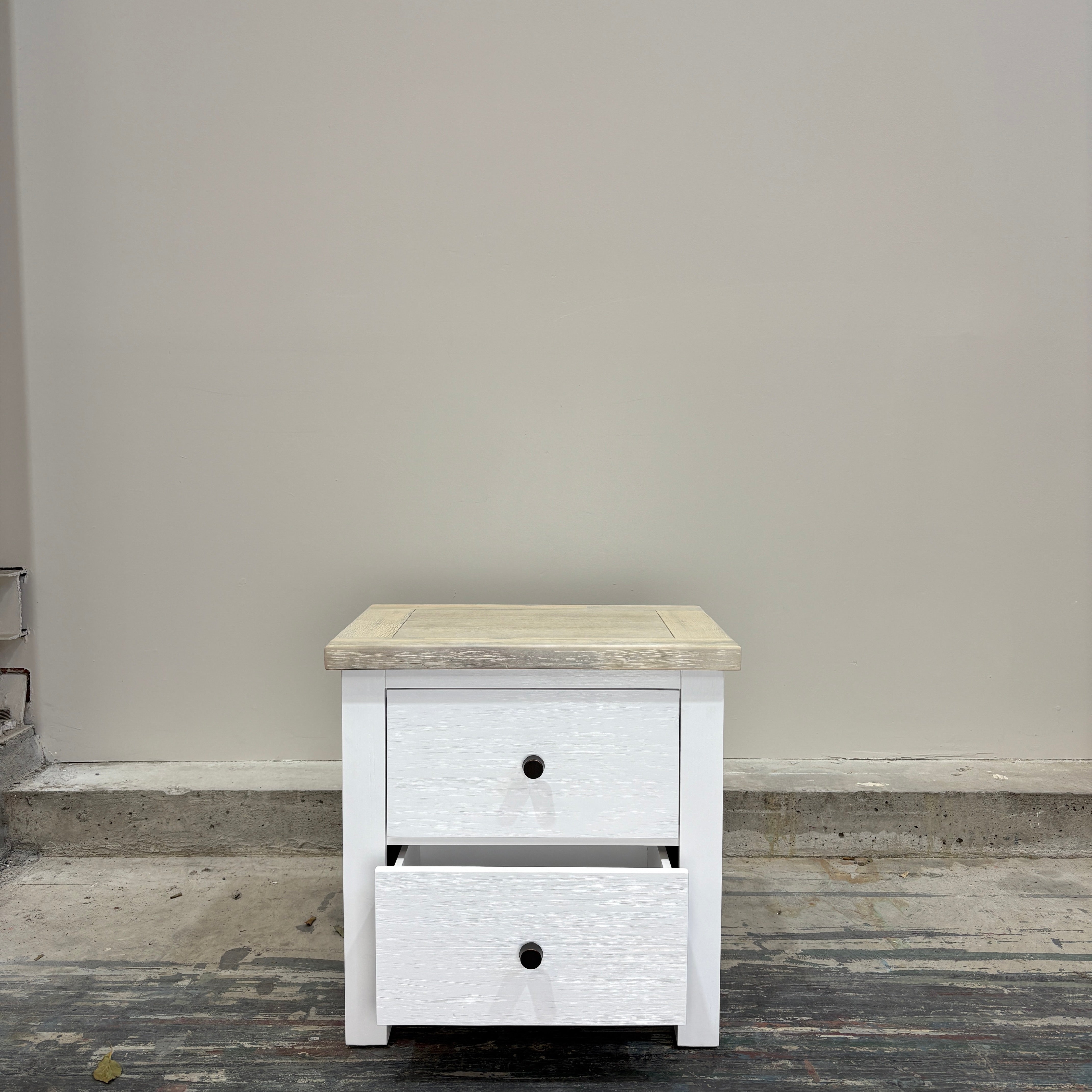 Add a touch of coastal charm to your living space with the Kinloch Bedside Cabinet. With its clean white finish and subtle rustic woodgrain top, this compact 2 drawer cabinet offers both visual appeal and everyday practicality. It delivers understated elegance and useful storage.