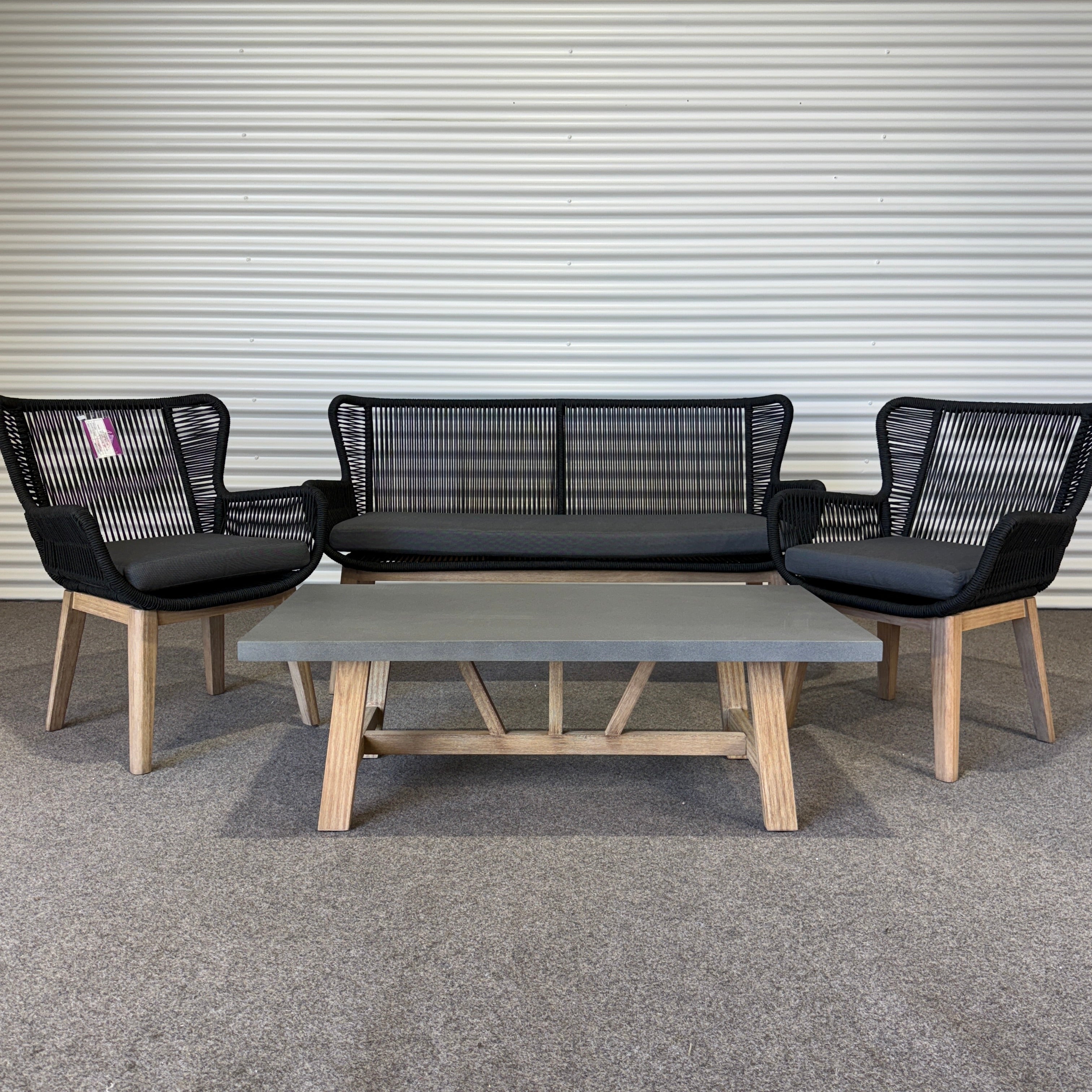 The set includes a 2-seater sofa, two armchairs, and a matching coffee table with a durable tabletop finish. The modern rope design offers breathability and comfort, while the sturdy timber base ensures lasting strength and stability.