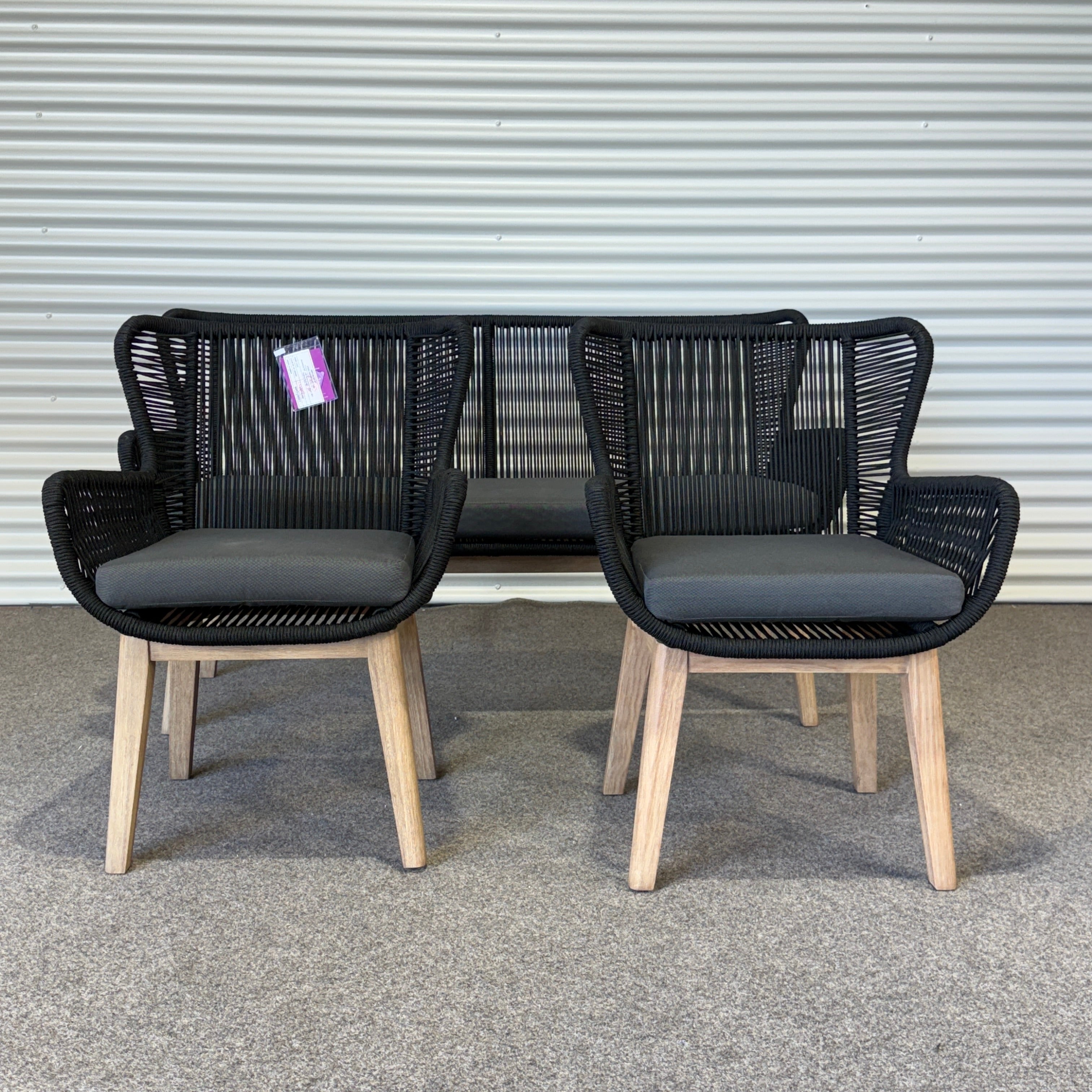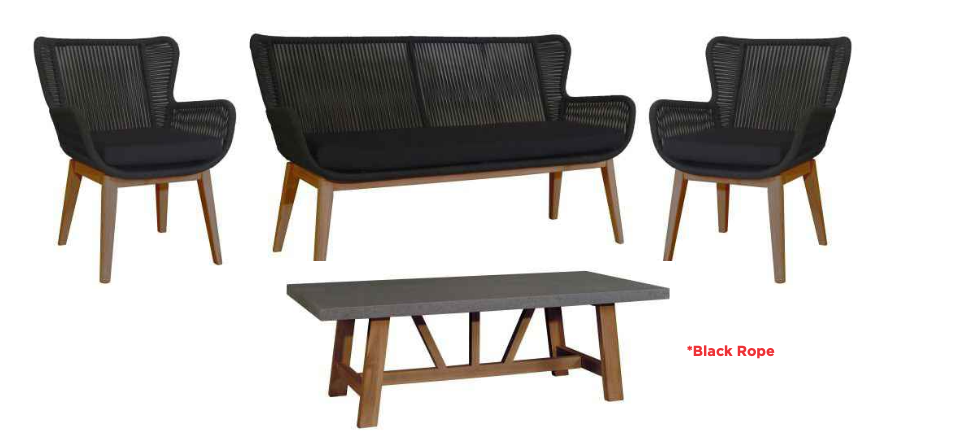 Turn your backyard into a private retreat with the Marrakesh Outdoor Lounge Set. Crafted with a sleek black rope weave and solid timber legs, this set brings a touch of luxury to any outdoor space — perfect for relaxing, entertaining, or soaking up the sun in style.