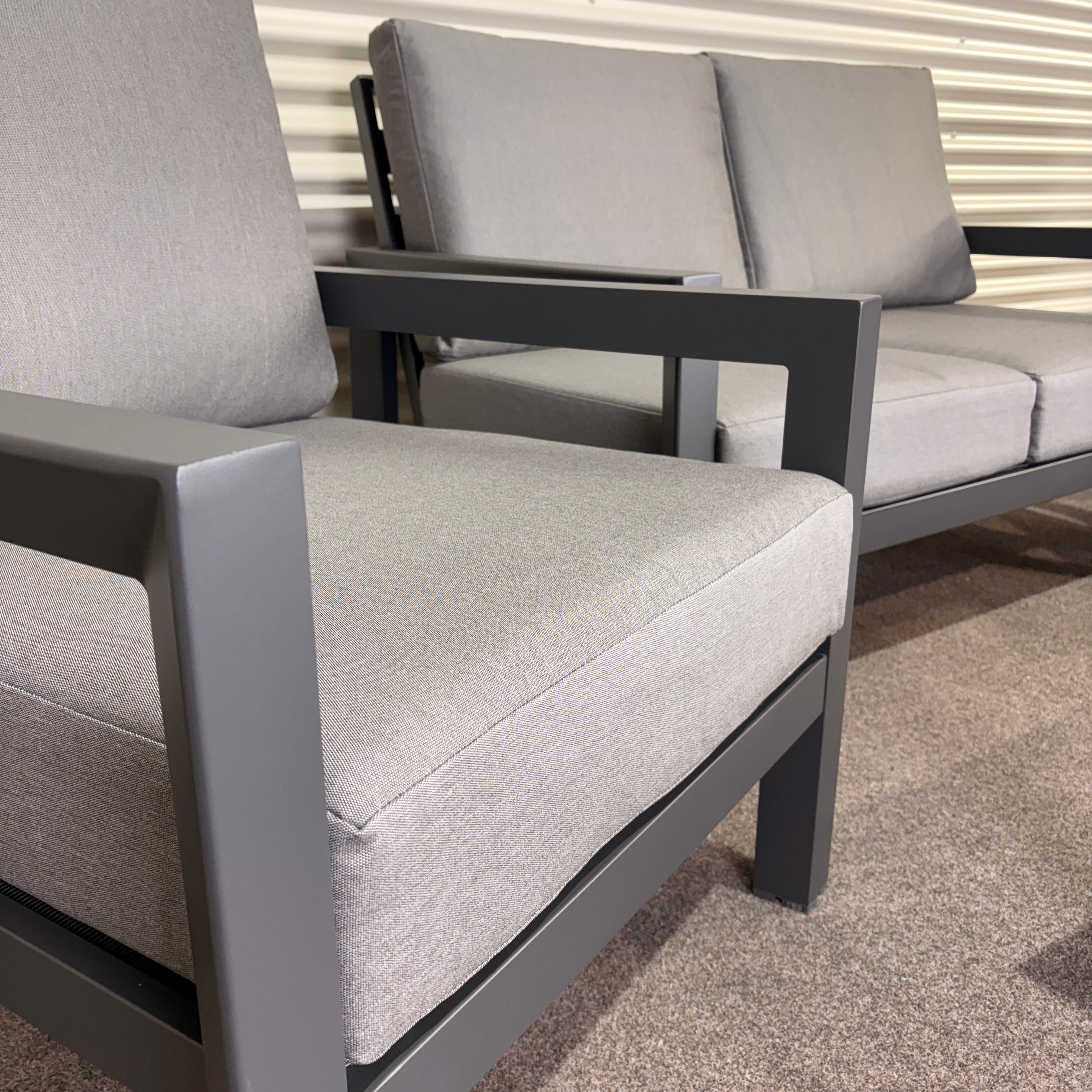 - Deep, comfortable seating with plush Alpha Grey cushions