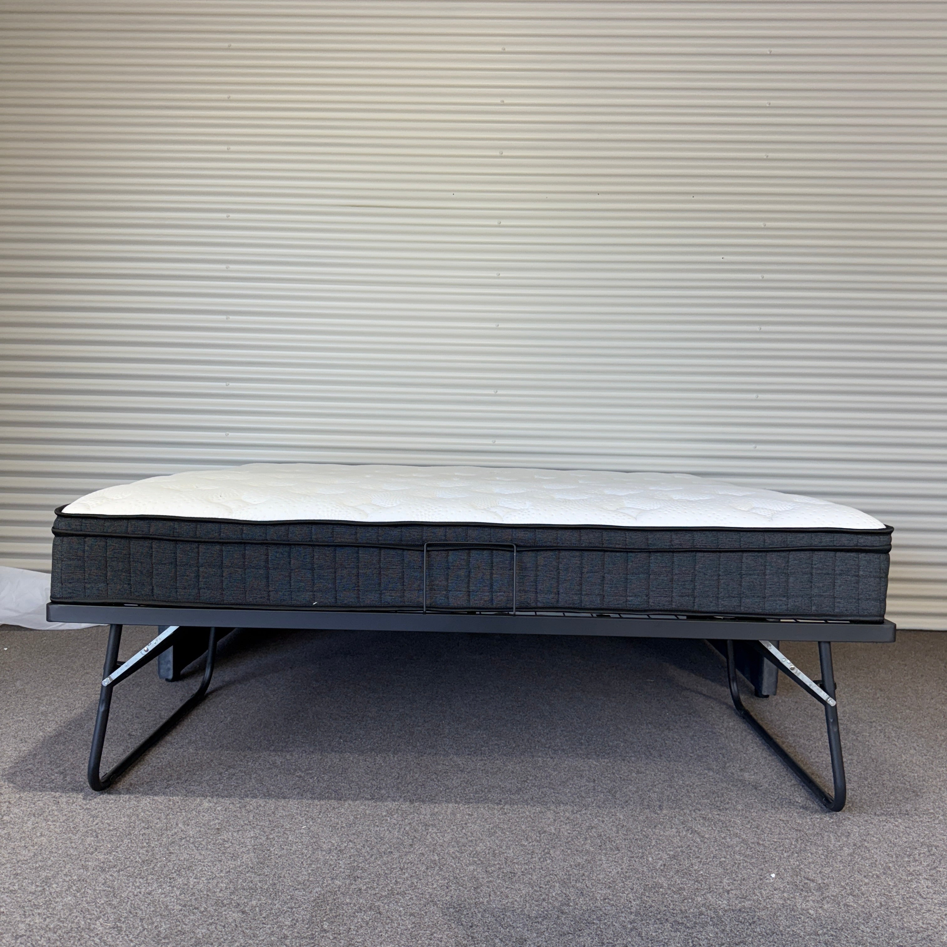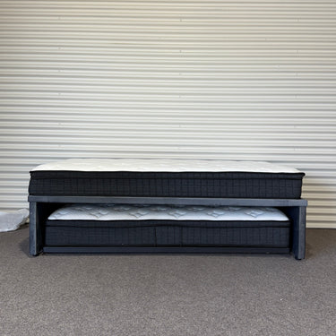 The sturdy metal trundler frame features a King Single upper base and a Single roll-out lower bed that tucks neatly underneath when not in use. Paired with our Tasman NZ-Made Pocket Spring Mattresses, you’ll get everyday comfort that’s built to last.