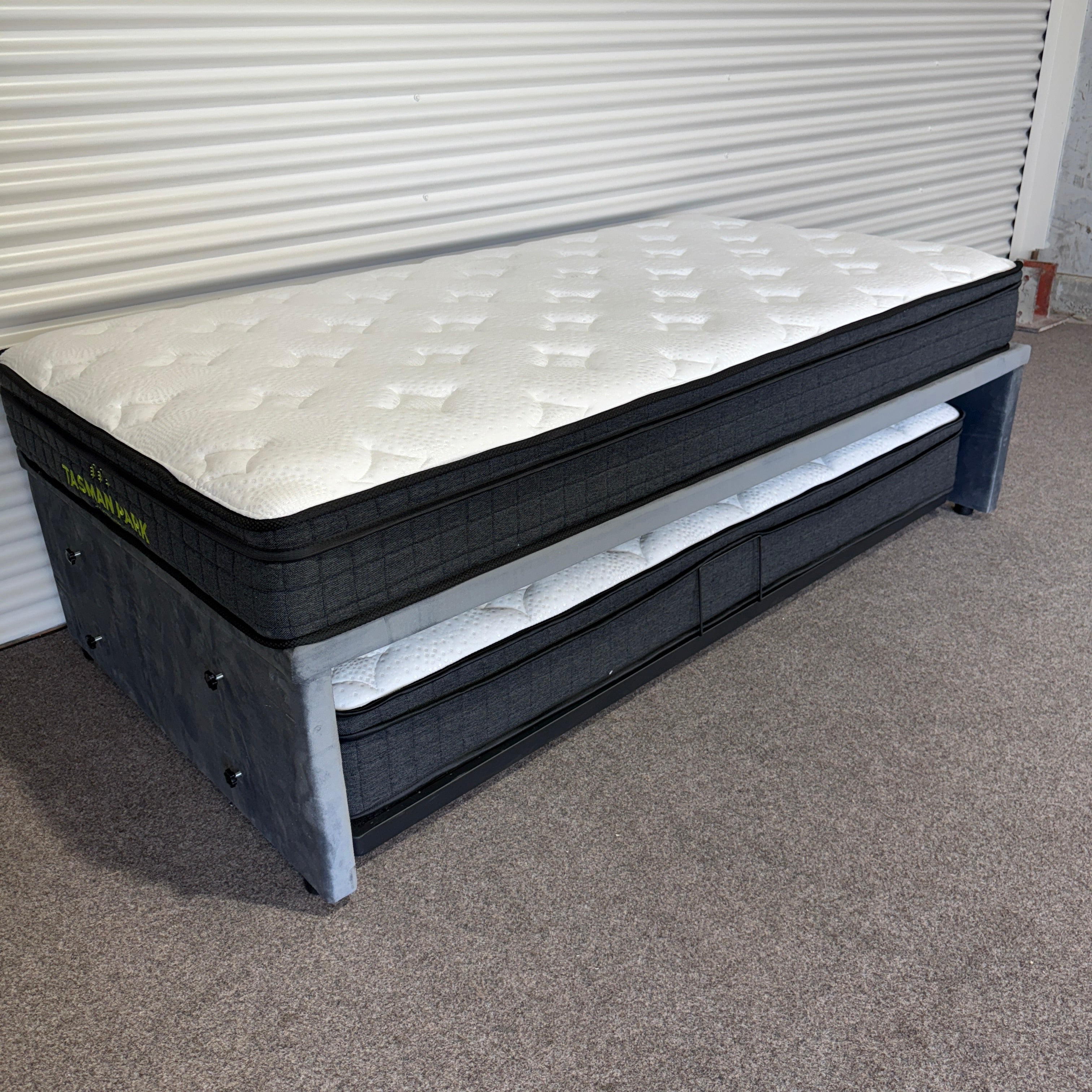 Smart space-saving design meets New Zealand craftsmanship. This Trundler Bed + Tasman Pocket Spring Mattress Set gives you everything you need for guests, teens, or shared spaces — no compromise on comfort or support.